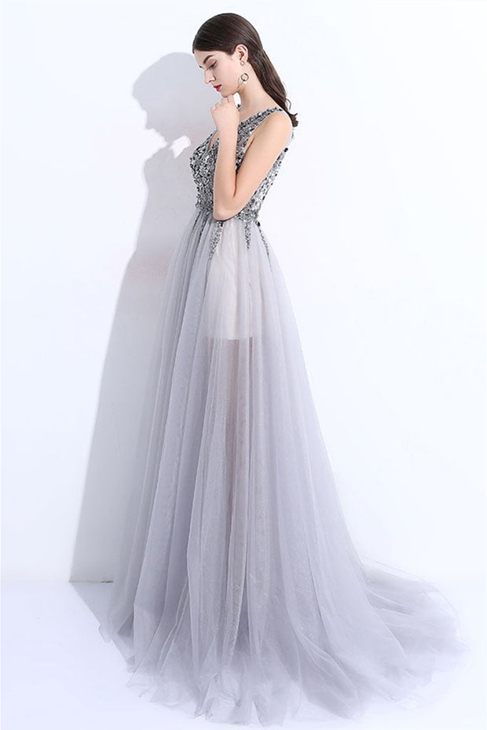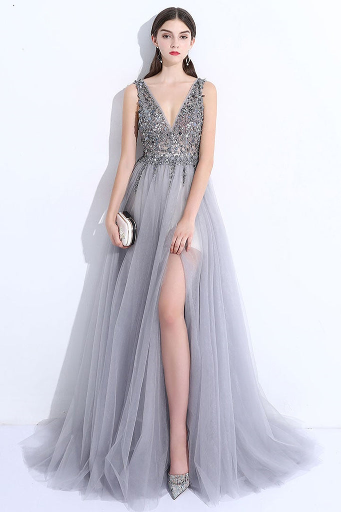 A Line V Neck Gray Tulle Beaded Long Prom Dresses, V Neck Gray Formal Dresses with Sequins, Beaded Gray Evening Dresses