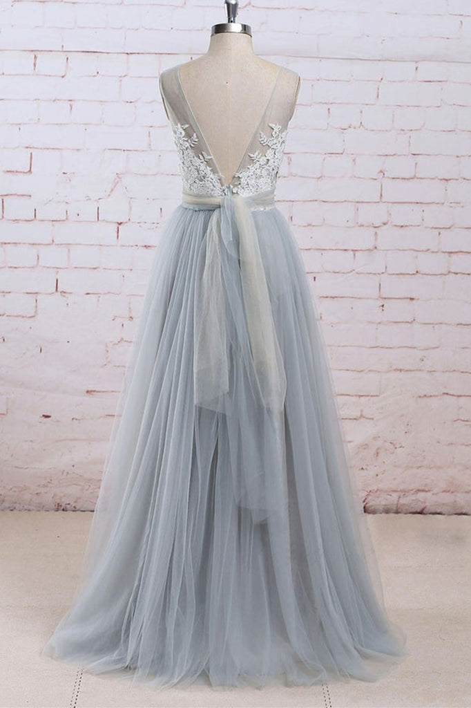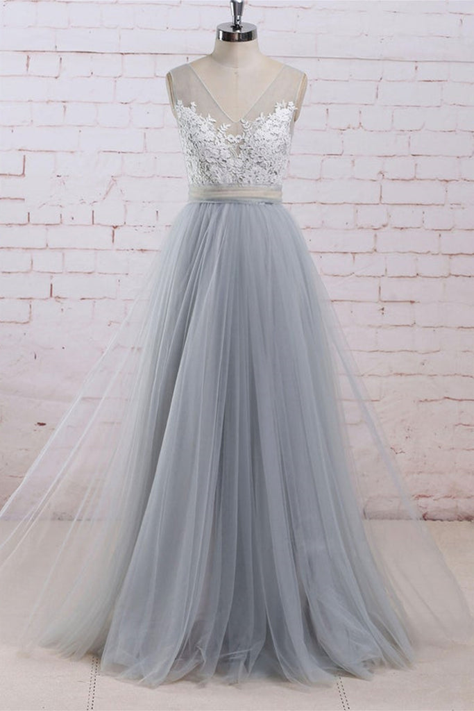 A Line V Neck Gray Tulle Long Prom Dresses with Lace Top, V Neck Gray Formal Dresses, Gray Lace Evening Dresses