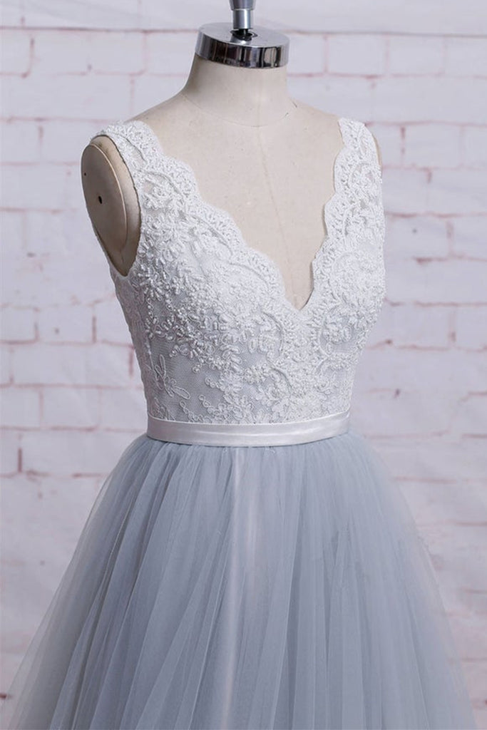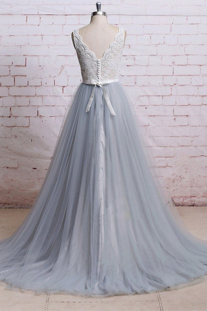 A Line V Neck Gray Tulle Long Prom Dresses with White Lace Top, White Lace Gray Formal Graduation Evening Dresses