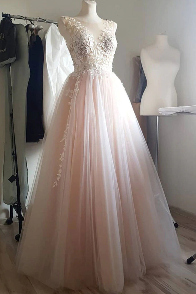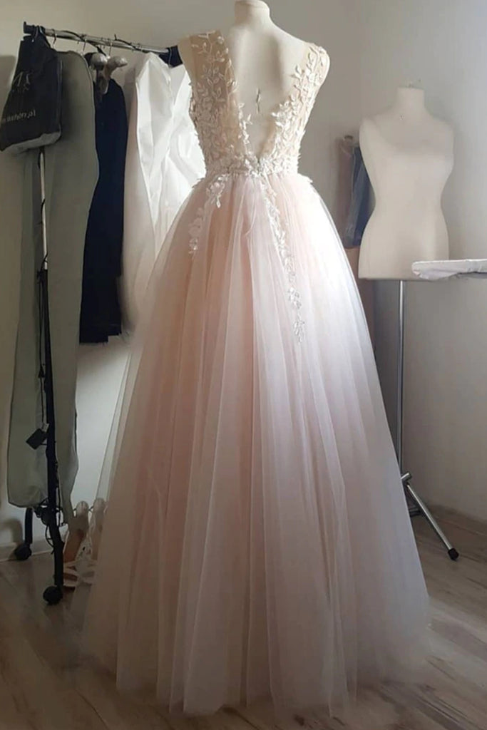 A Line V Neck Light Pink Lace Long Prom Dresses, V Neck Light Pink Formal Dresses, Light Pink Lace Evening Dresses