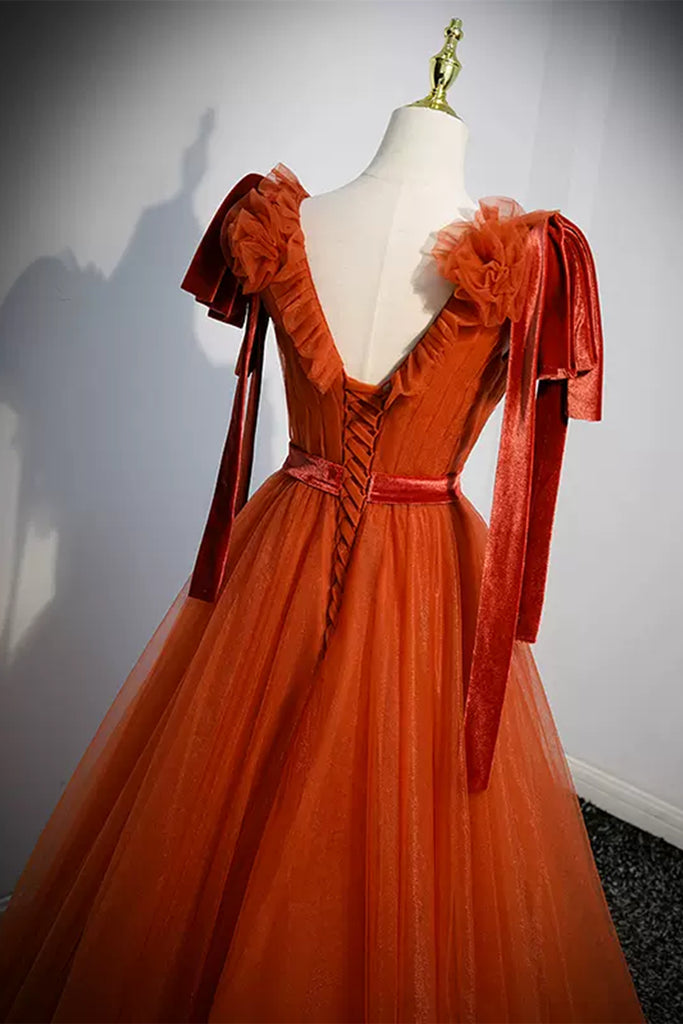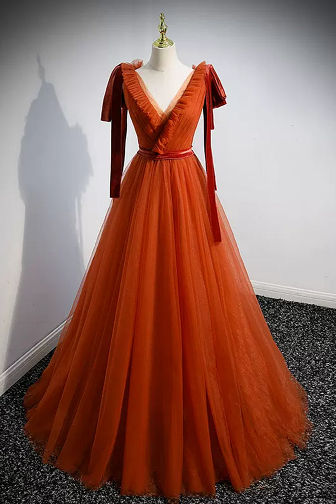 A Line V Neck Tulle Long Prom Dresses, V Neck Formal Evening Dresses WT1236