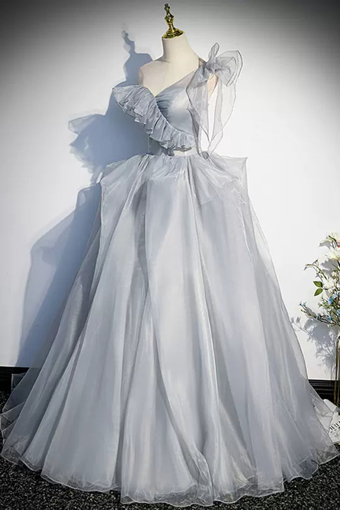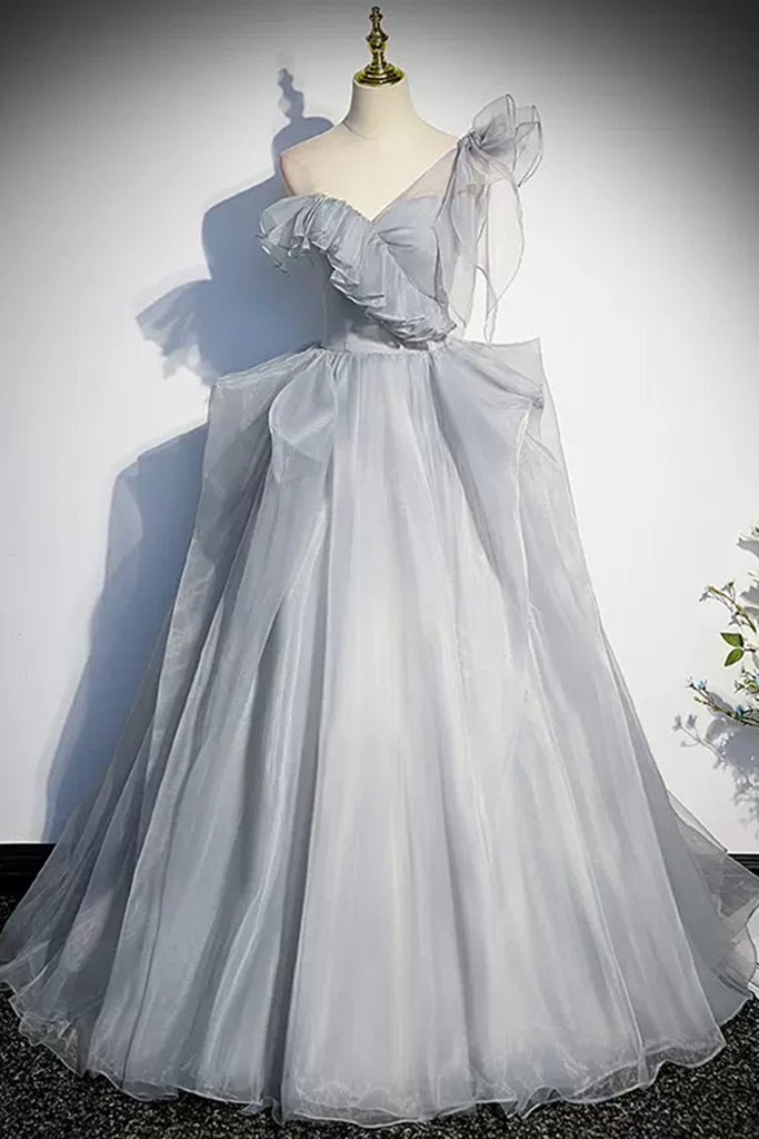 Beauty One Shoulder Gray Tulle Long Prom Dresses, Grey Formal Evening Dresses, Ball Gown WT1235