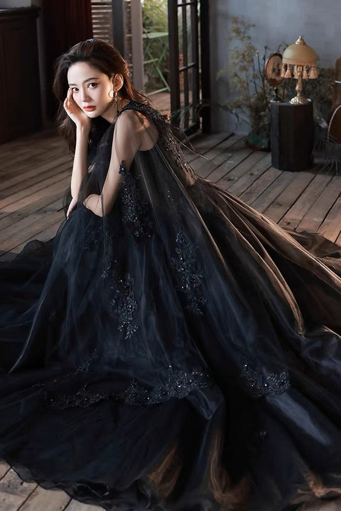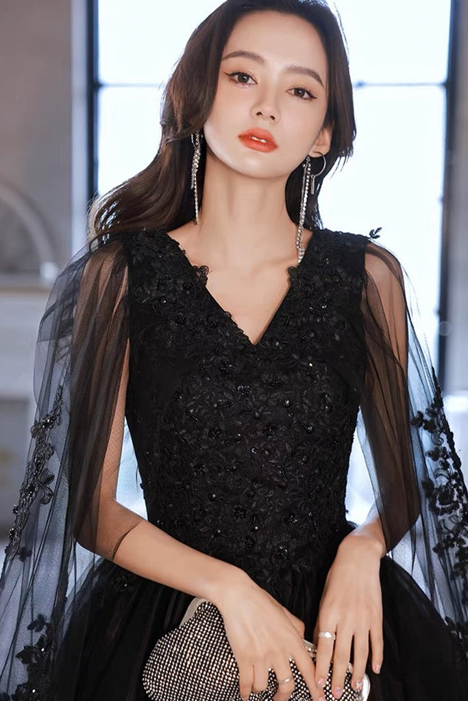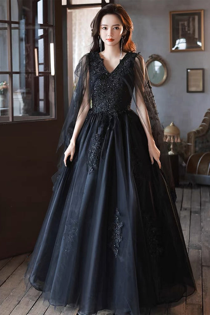 Black Lace V Neck Beaded Tulle Long Prom Dresses, Black Lace Formal Dresses, Black Evening Dresses WT1088