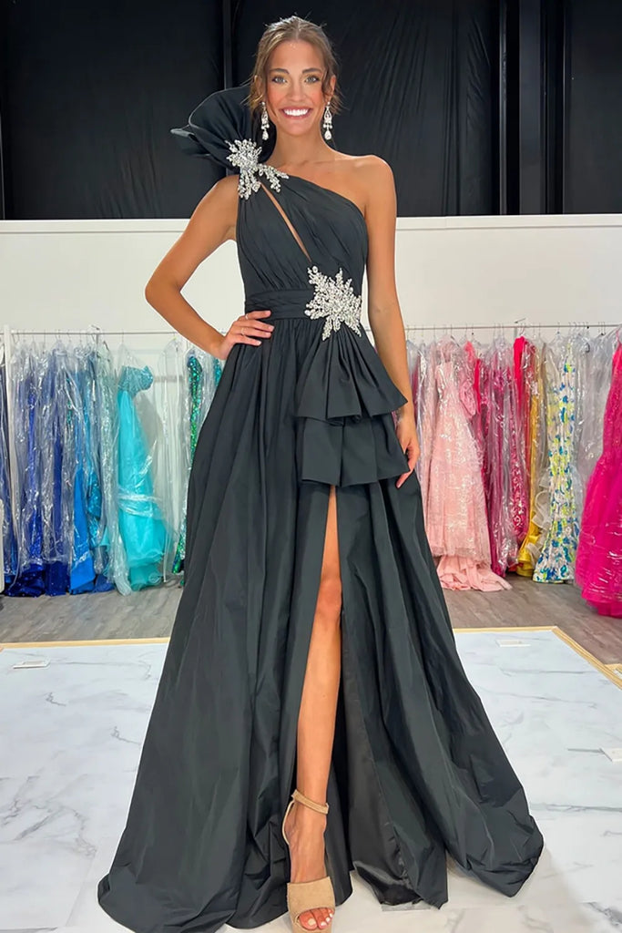 Black/Orange A Line One Shoulder High Slit Long Prom Dresses, Long Black/Orange Formal Graduation Evening Dresses WT1581