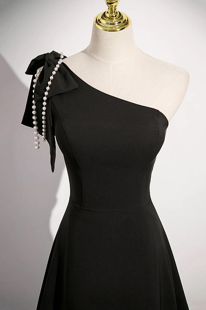 Black Satin A Line One Shoulder Long Prom Dresses, Long Black Formal Graduation Evening Dresses WT1660