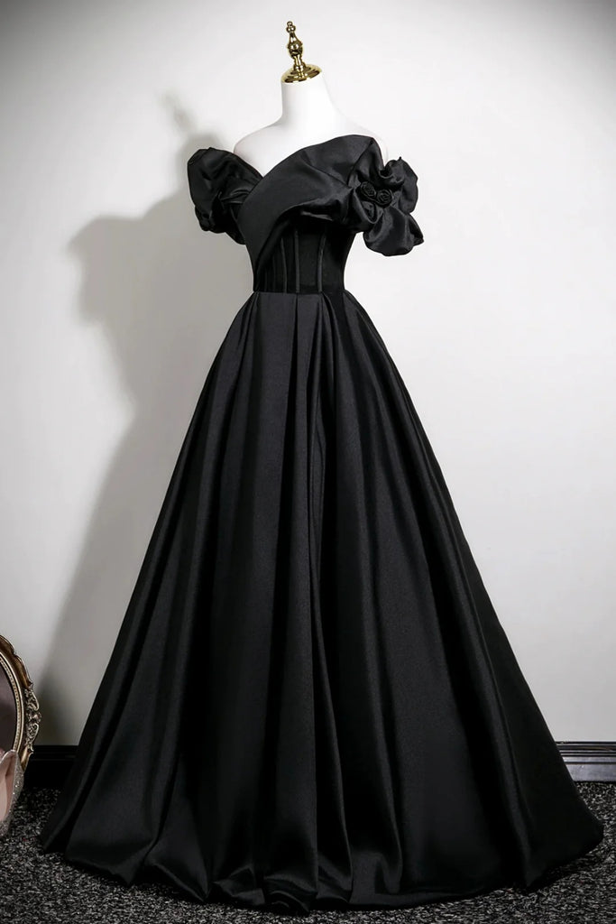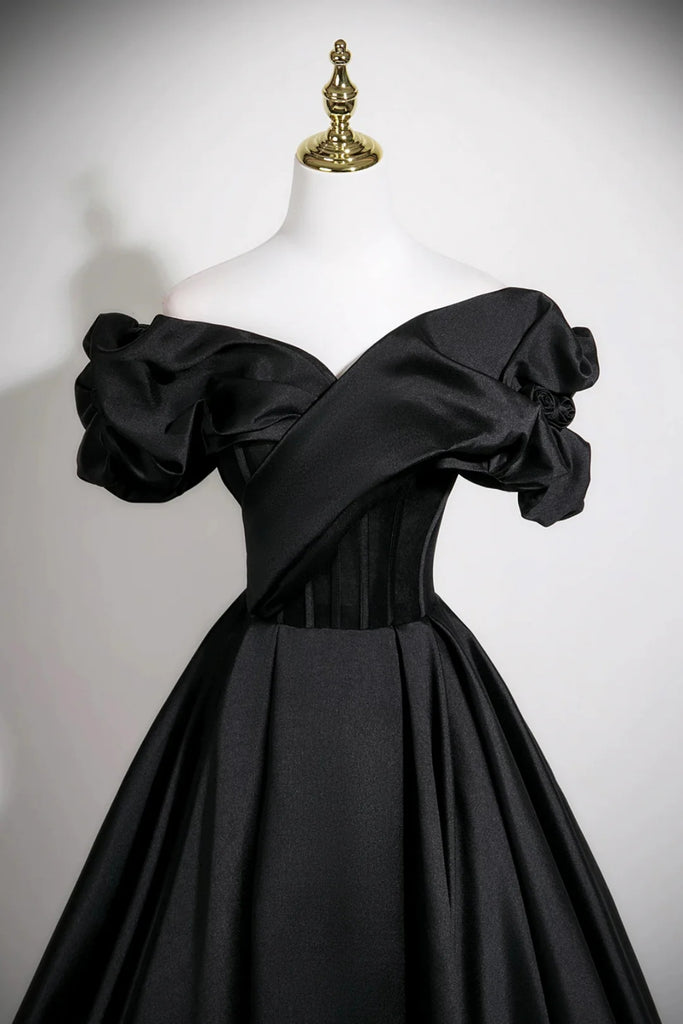 Black Satin Off the Shoulder Long Prom Dresses, Off Shoulder Black Formal Graduation Evening Dresses WT1684