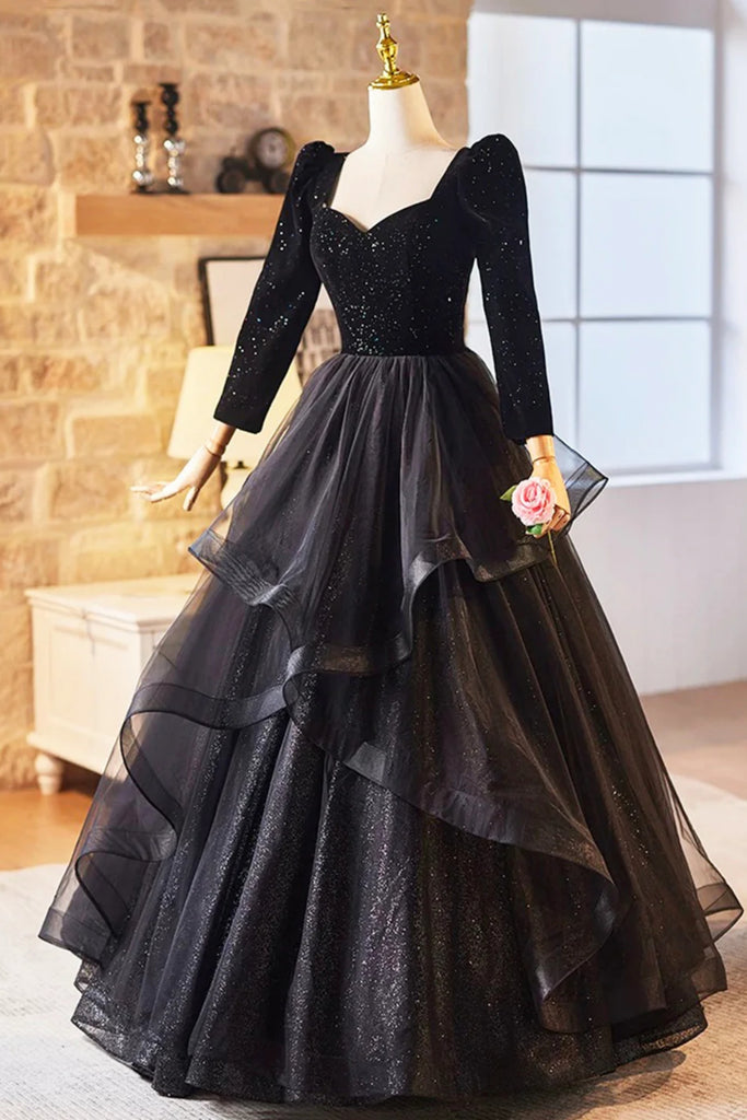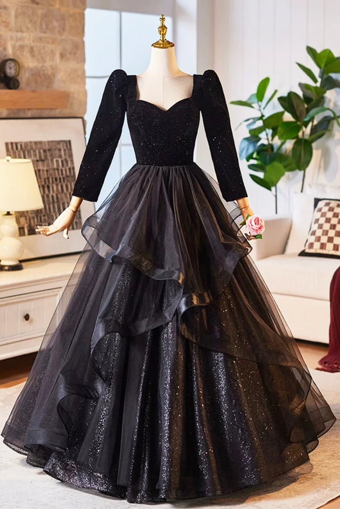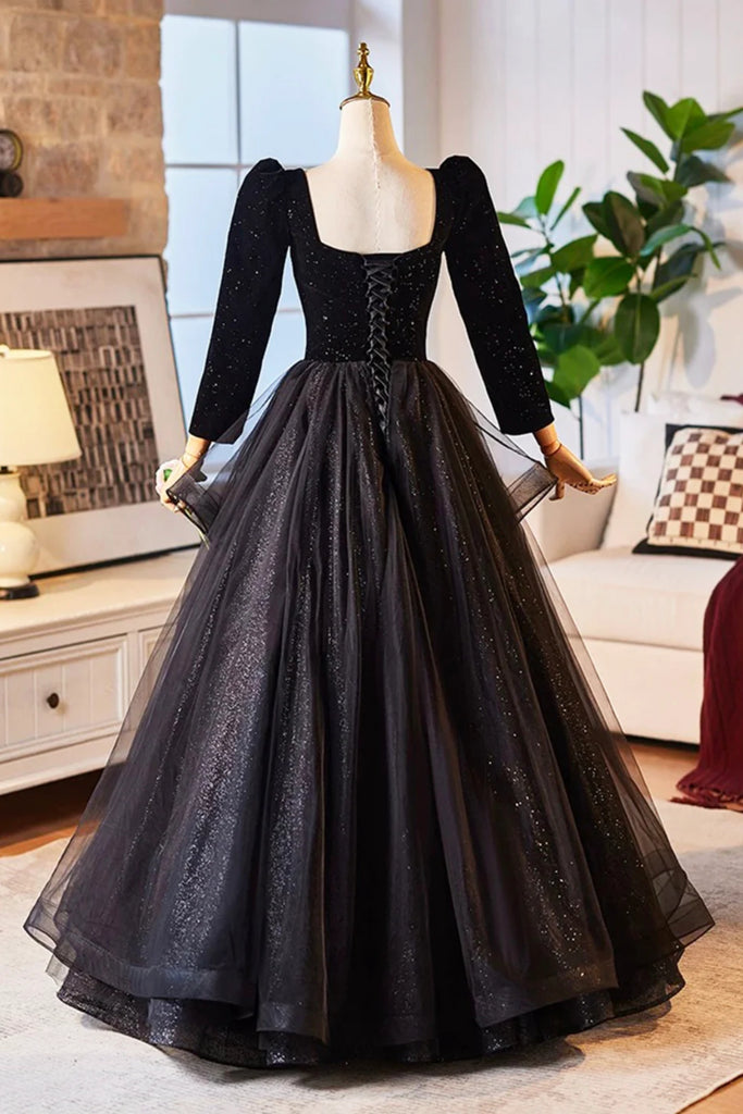 Black Shiny Long Sleeves Floor Length Long Prom Dresses, Long Black Formal Evening Dresses, Ball Gown WT1573