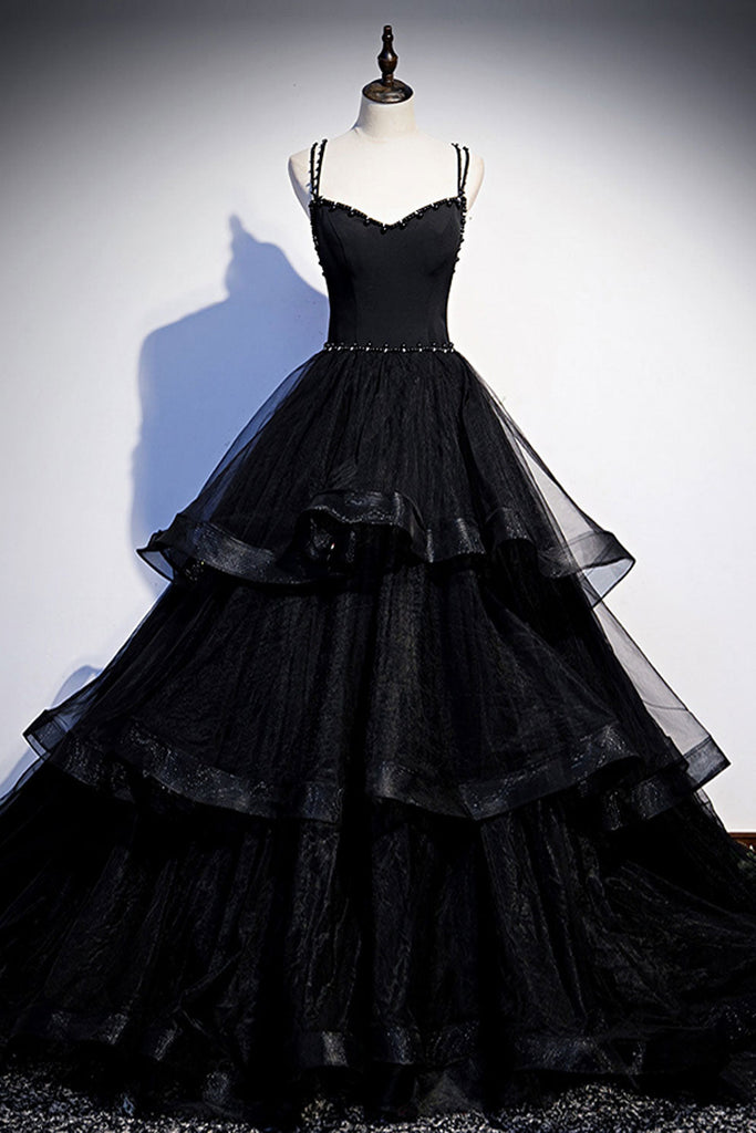 Black Tulle Open Back V Neck Beaded Layered Long Prom Dresses, Black Formal Evening Dresses with Pearls, Black Ball Gown WT1118
