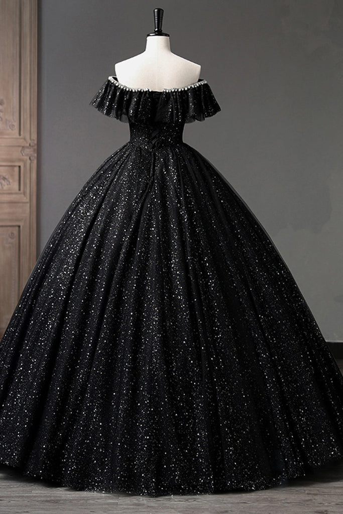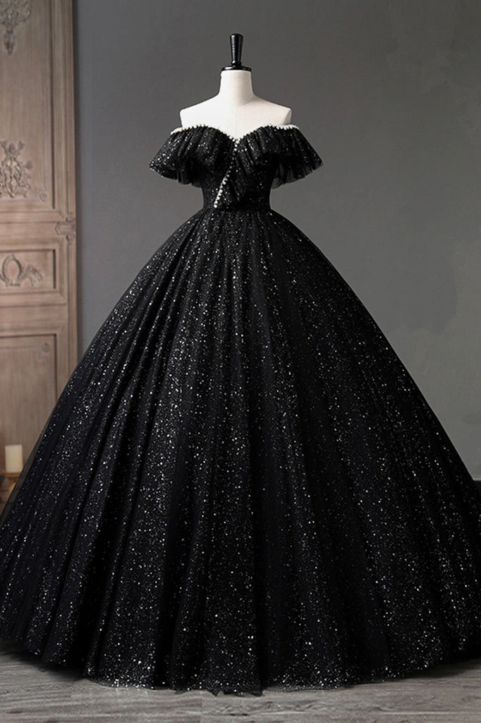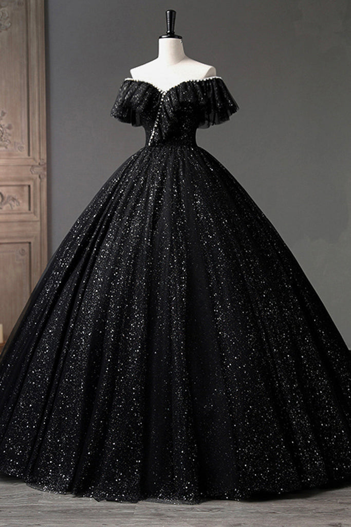 Black Tulle Shiny Off Shoulder Long Prom Dresses with Pearls, Long Black Formal Evening Dresses, Black Ball Gown WT1158