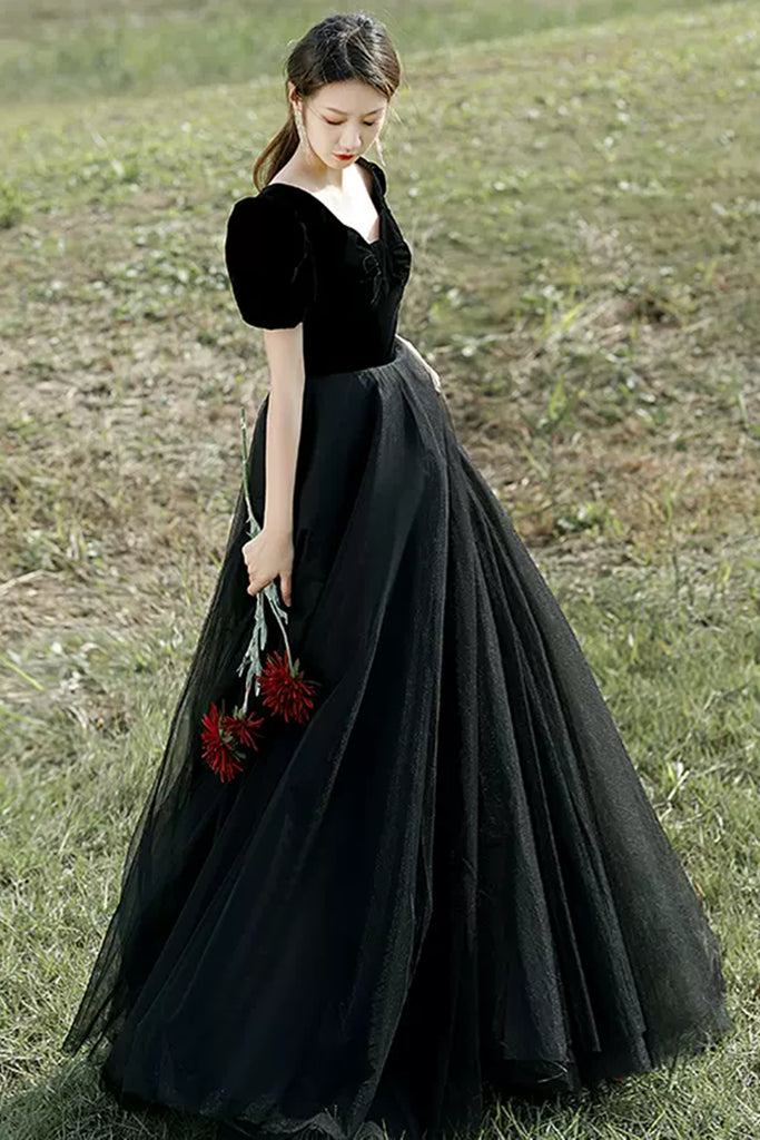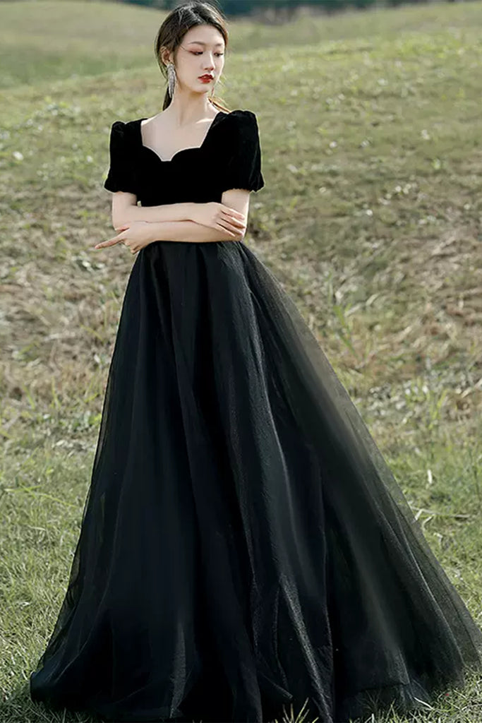Black Tulle Short Sleeves Long Prom Dresses, Long Black Formal Graduation Evening Dresses WT1189