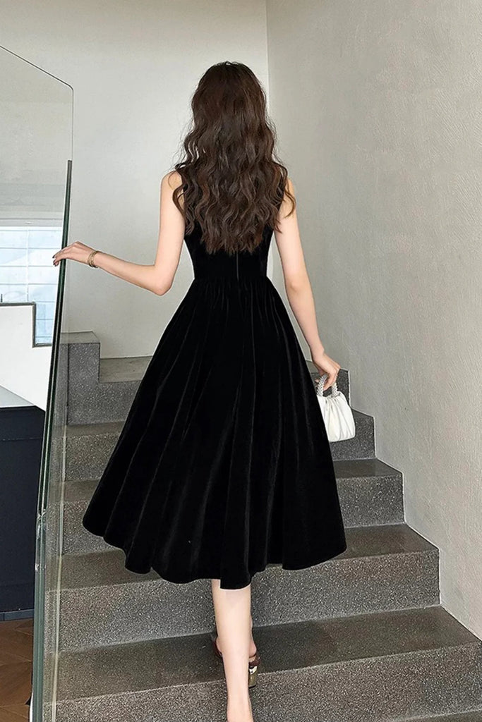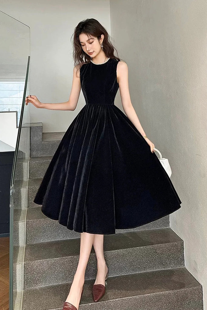 Black Velvet A Line Round Neck Short Prom Dresses with Pearls, Black Velvet Homecoming Dresses WT1649