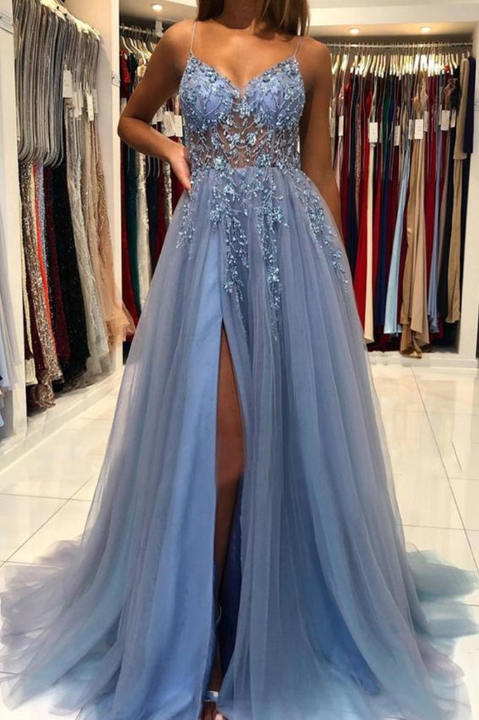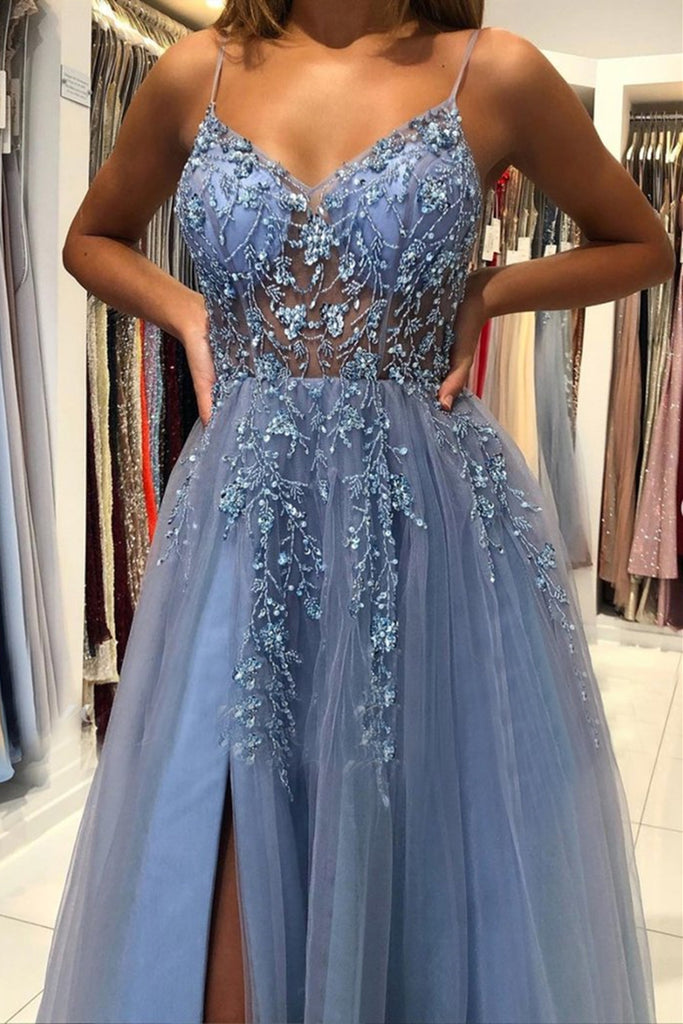 Blue Beaded Long Prom Dresses, Blue Beaded Long Formal Graduation Dresses