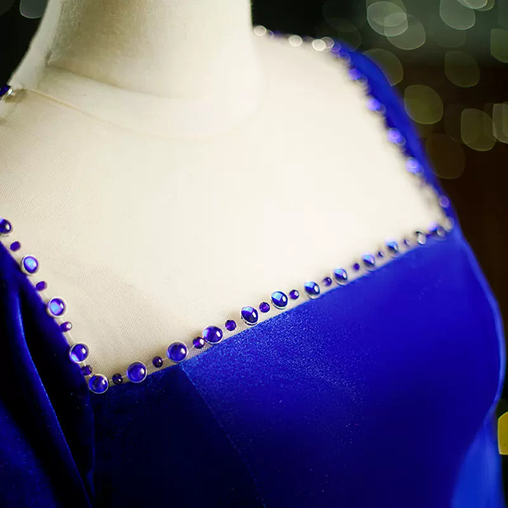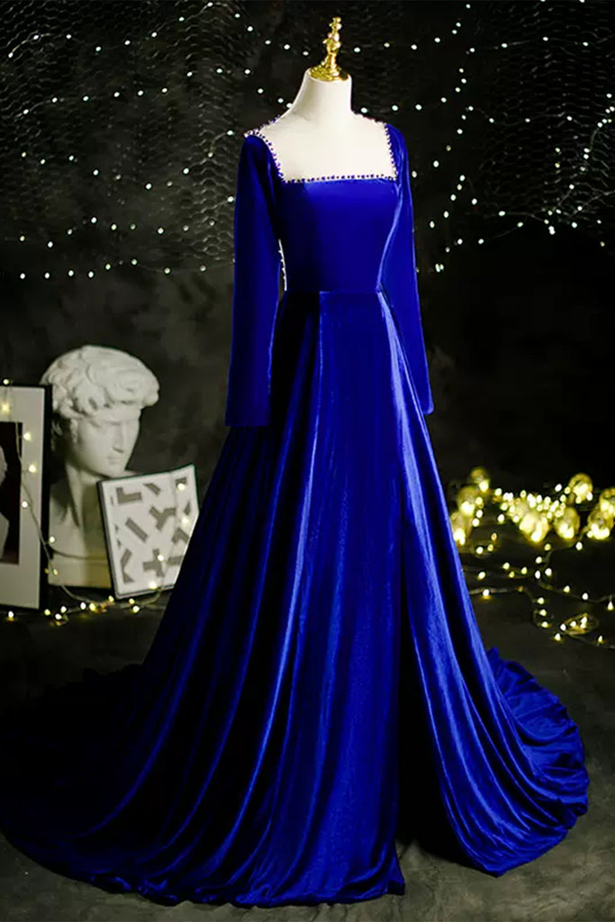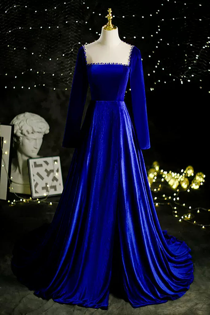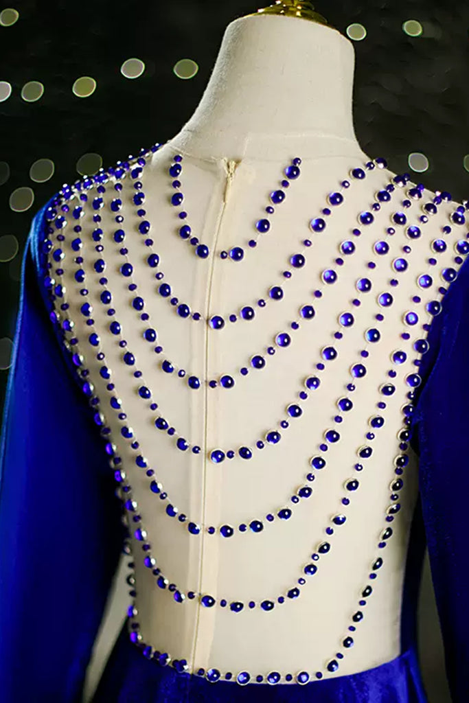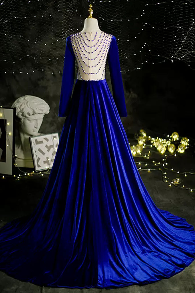 Blue Gorgeous Long Sleeves Beaded Long Prom Dresses, Blue Formal Evening Dresses WT1182