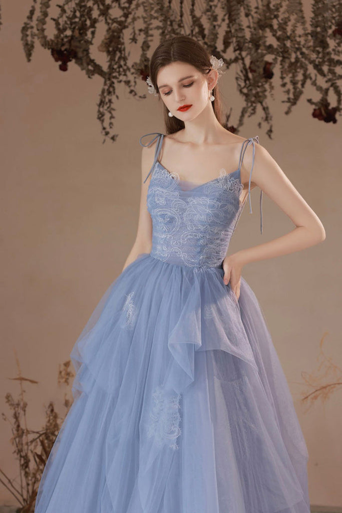 Blue Lace A Line V Neck Long Prom Dresses, V Neck Blue Formal Dresses, Blue Lace Evening Dresses WT1066