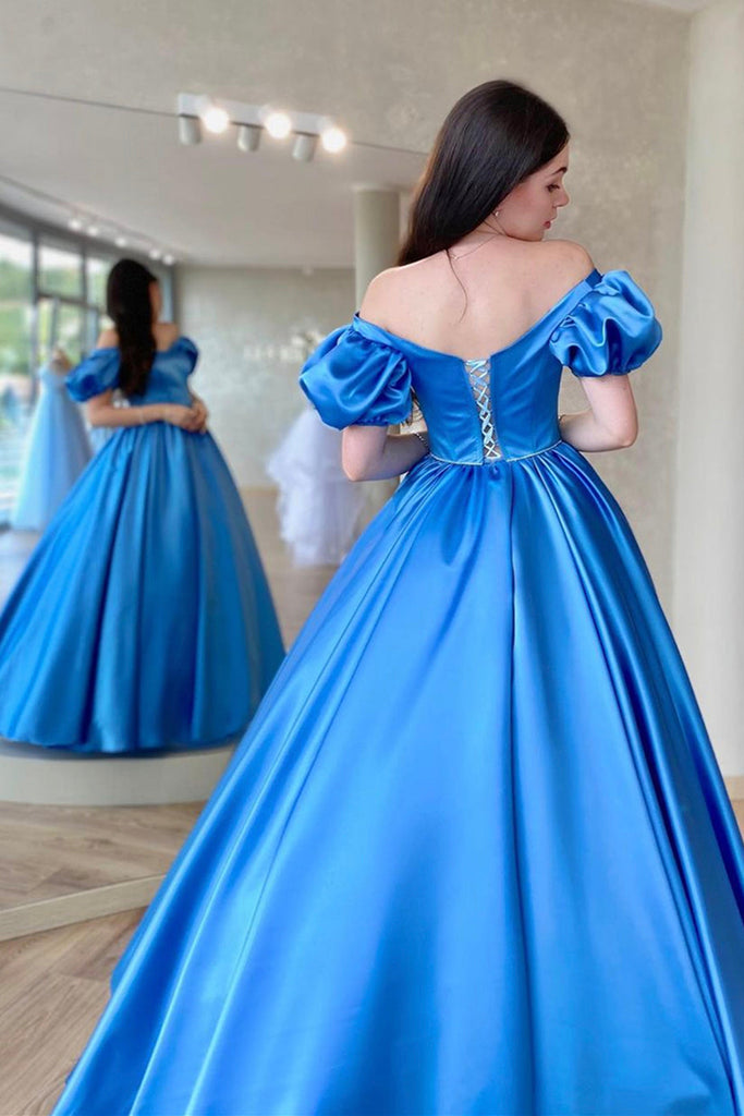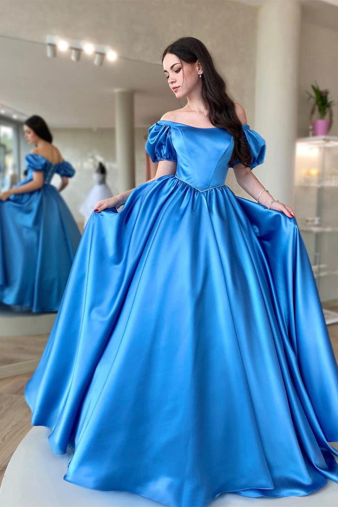 Blue Satin Off the Shoulder Long Prom Dresses, Off Shoulder Blue Formal Dresses, Blue Evening Dresses WT1127