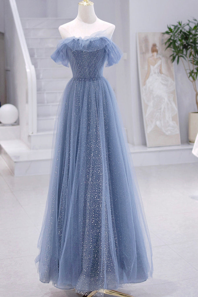 Blue Tulle A Line Off Shoulder Long Prom Dresses, Off the Shoulder Blue Formal Graduation Evening Dresses WT1227