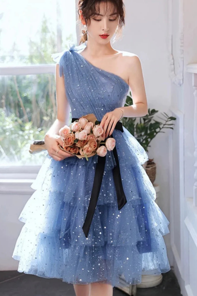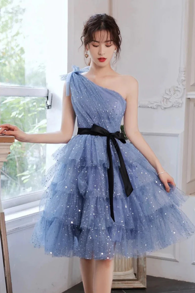 Blue Tulle A Line One Shoulder Layered Short Prom Dresses, One Shoulder Blue Homecoming Dresses WT1673