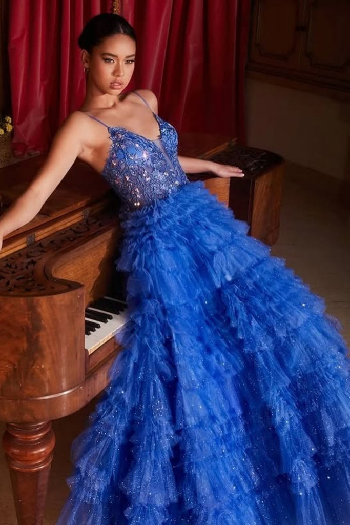 Blue Tulle A Line V Neck Beaded Ruffle Long Prom Dresses, Blue Lace Formal Dresses, Beaded Blue Evening Dresses WT1737