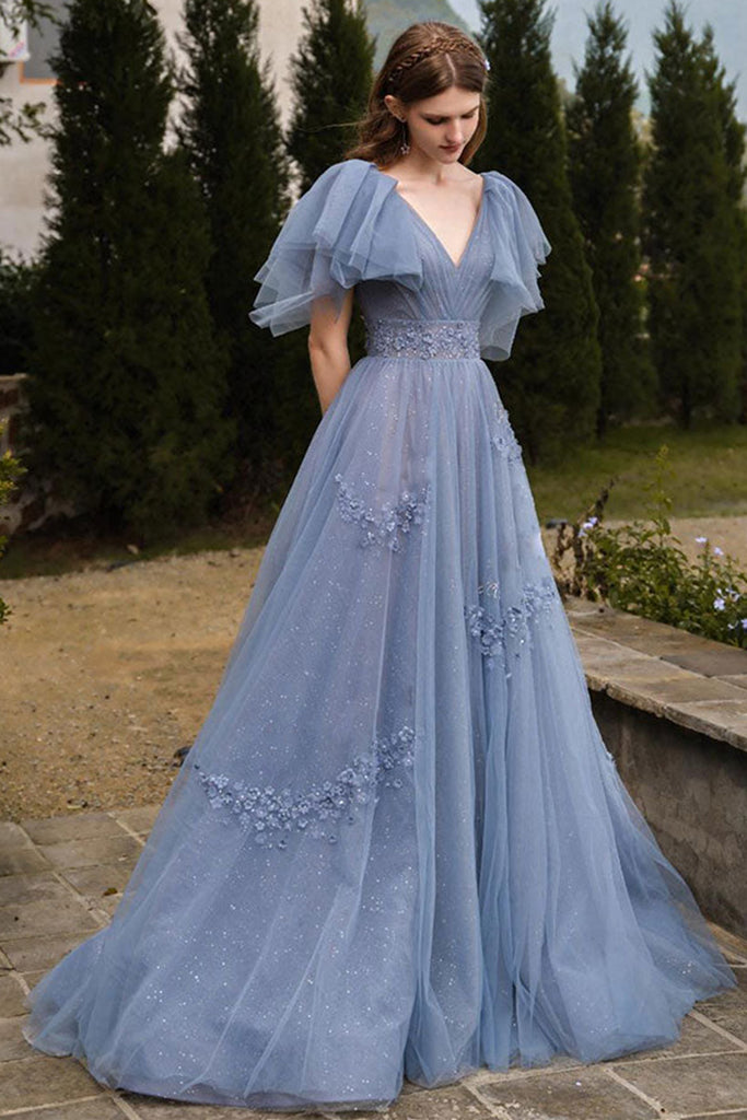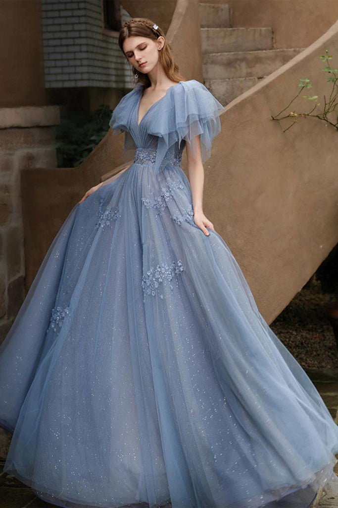 Blue Tulle Cap Sleeves V Neck Lace Long Prom Dresses, V Neck Blue Formal Dresses, Blue Evening Dresses with Appliques WT1056