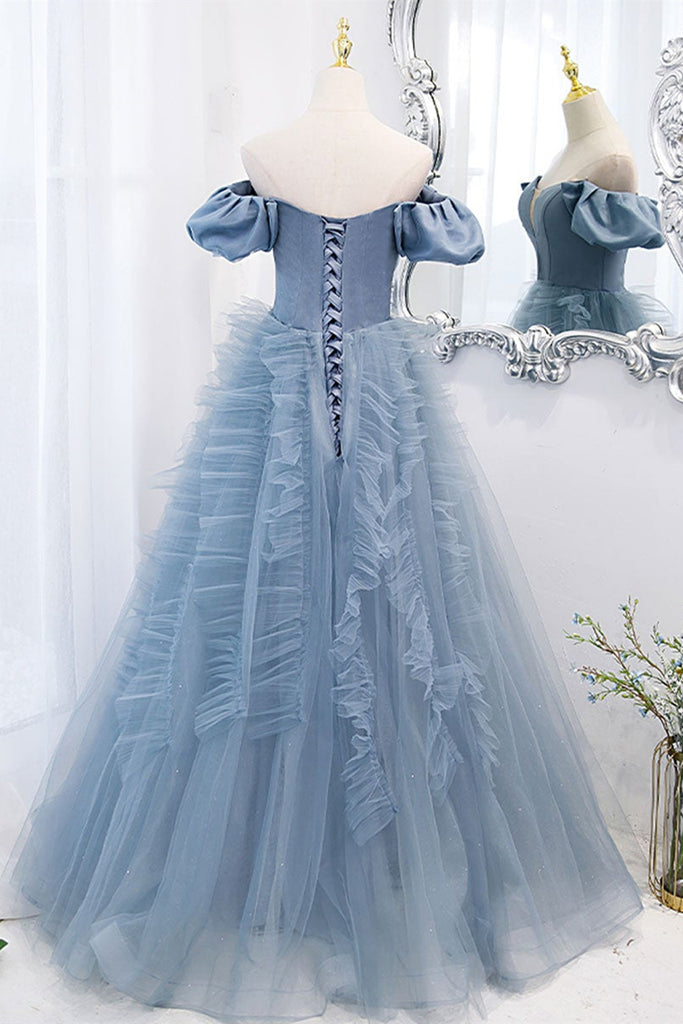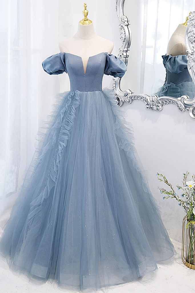 Blue Tulle Off Shoulder Long Prom Dresses, V Neck Blue Formal Dresses, Blue Evening Dresses