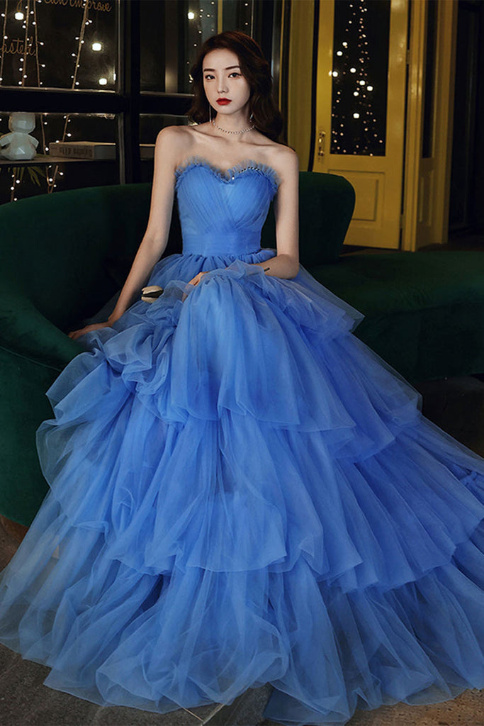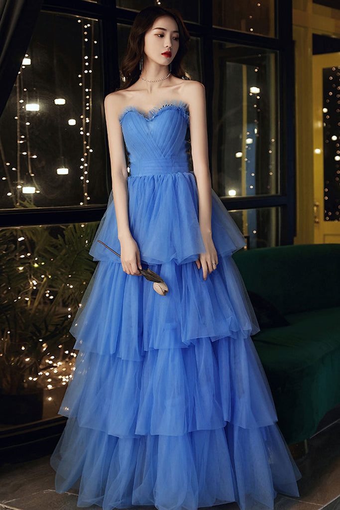 Blue Tulle Strapless Layered Long Prom Dresses, Strapless Blue Formal Evening Dresses, Blue Ball Gown WT1052
