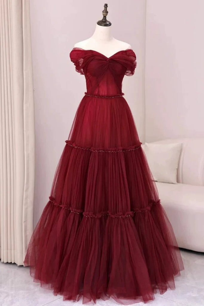 Burgundy Tulle A Line Off the Shoulder Long Prom Dresses, Long Burgundy Formal Graduation Evening Dresses WT1584