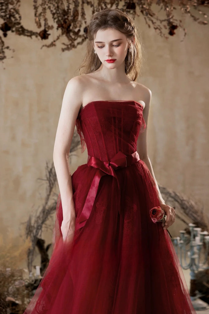 Burgundy Tulle A Line Strapless Long Prom Dresses, Wine Red Tulle Formal Graduation Evening Dresses WT1567