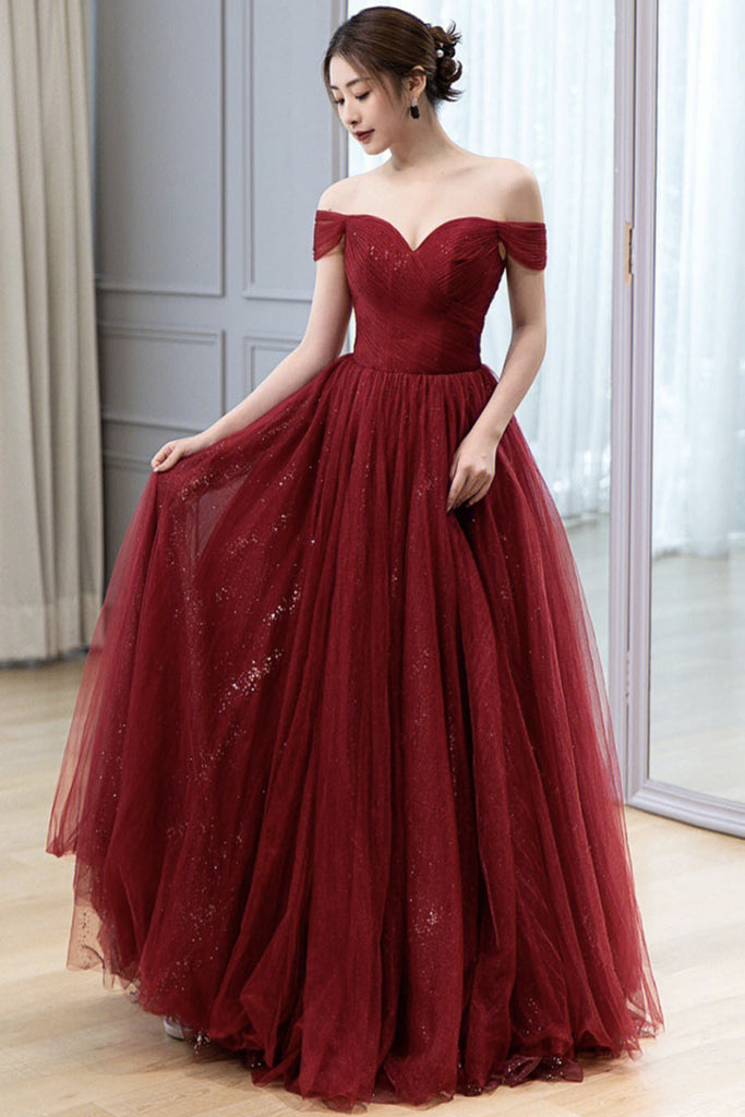 Burgundy Tulle Off Shoulder Long Prom Dresses, Off the Shoulder Burgundy Formal Dresses, Maroon Evening Dresses WT1126