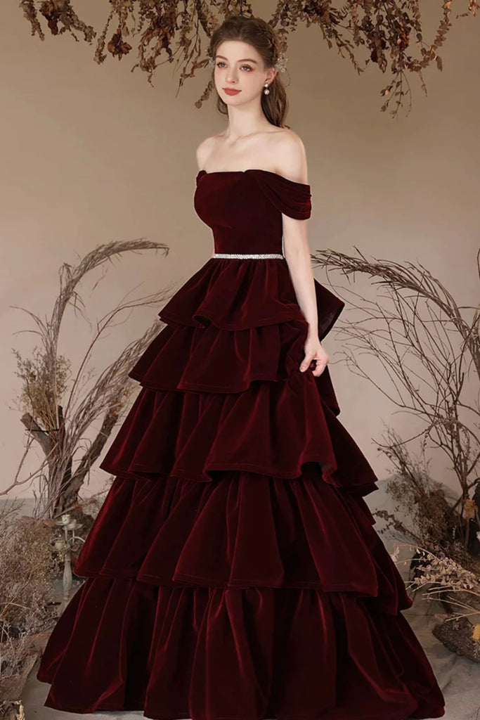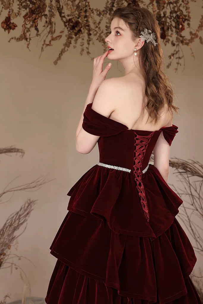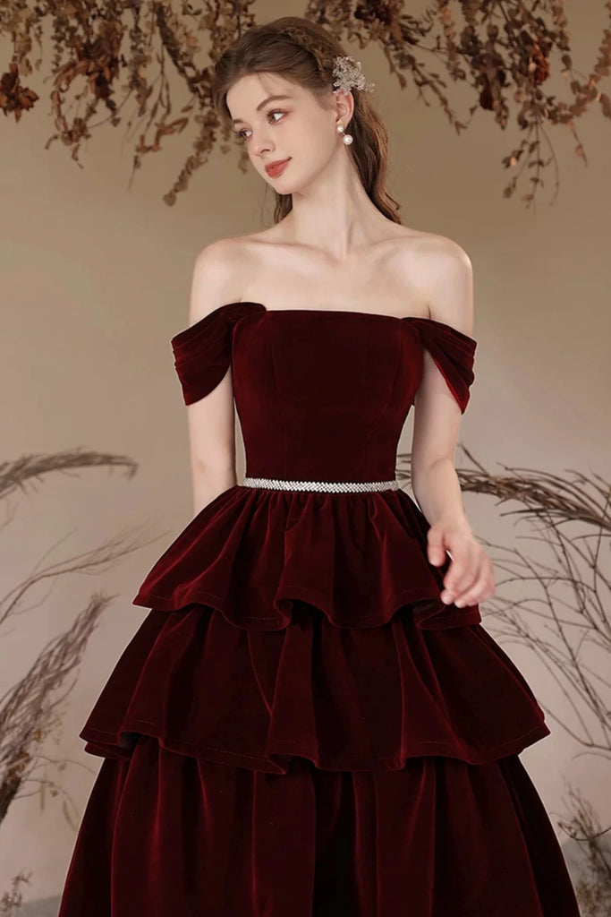 Burgundy Velvet Off Shoulder Layered Long Prom Dresses, Off the Shoulder Formal Dresses, Wine Red Velvet Evening Dresses WT1560