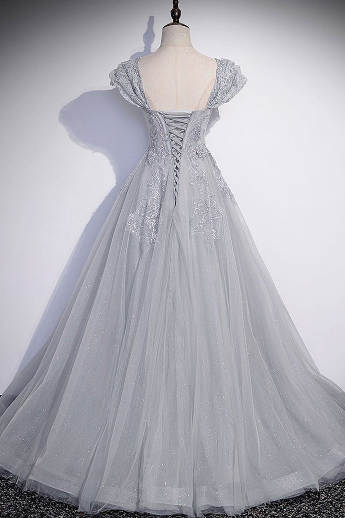 Cap Sleeves Shiny Gray Tulle Lace Long Prom Dresses, Gray Lace Formal Dresses, Gray Evening Dresses