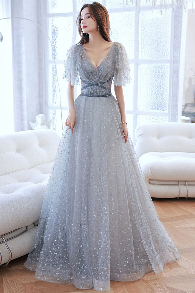 Cap Sleeves V Neck Gray Tulle Long Prom Dresses, Shiny V Neck Gray Formal Dresses, Grey Evening Dresses