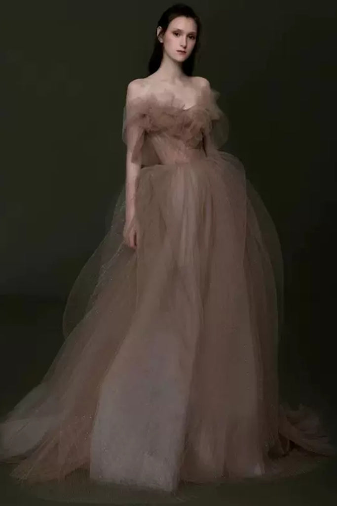 Champagne Elegant Strapless Tulle Long Prom Dresses, Champagne Tulle Formal Graduation Evening Dresses WT1198