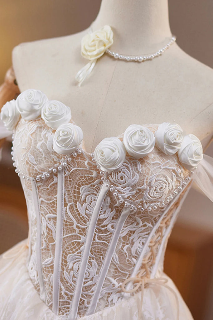 Champagne Lace Off the Shoulder Short Prom Dresses with Flowers, Champagne Lace Homecoming Dresses WT1671