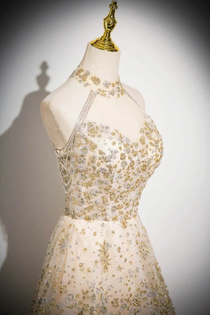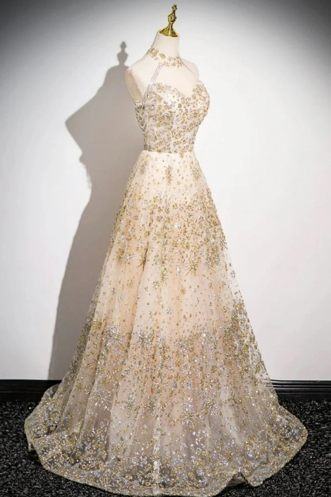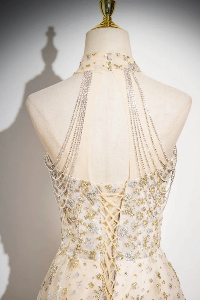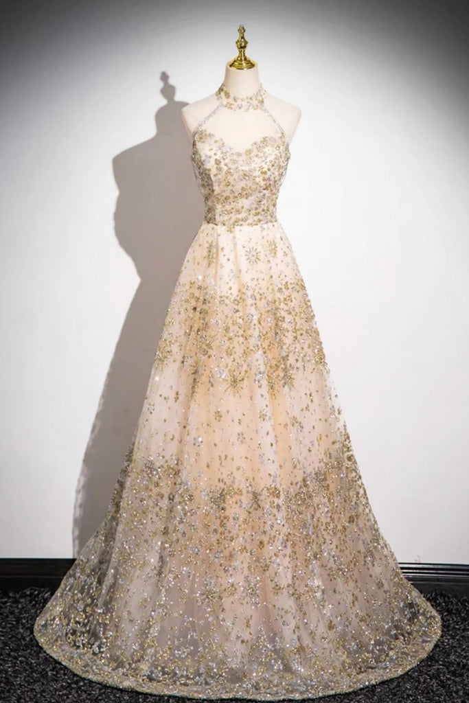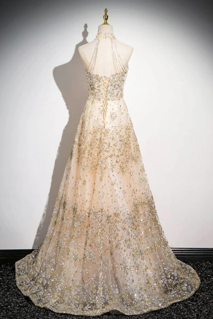 Champagne Sequins A Line High Neck Long Prom Dresses, Champagne Formal Graduation Evening Dresses WT1577