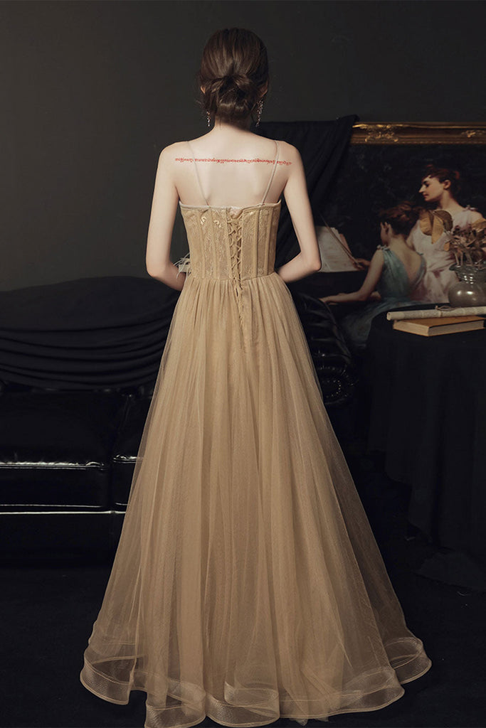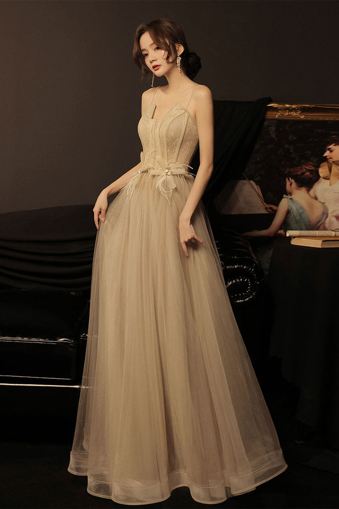 Champagne Tulle A Line Open Back Long Prom Dresses, Long Champagne Formal Evening Dresses WT1049