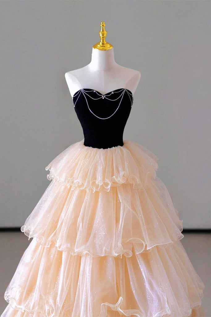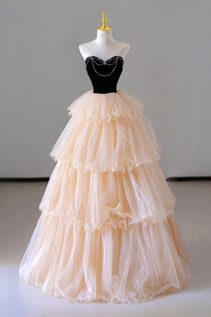 Champagne Tulle A Line Strapless Layered Long Prom Dresses, Champagne Formal Graduation Evening Dresses WT1163