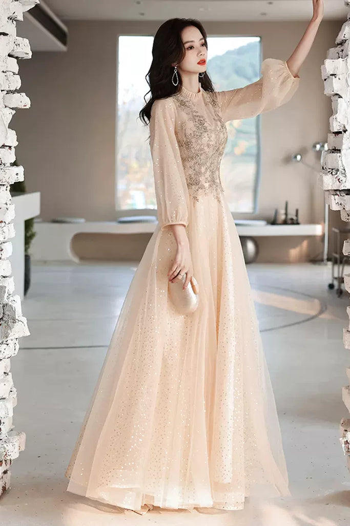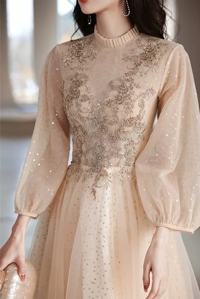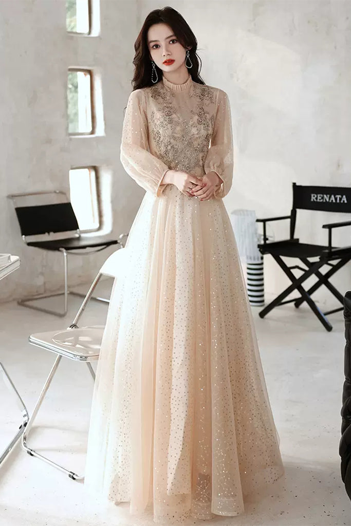 Champagne Tulle High Neck Long Sleeves Beaded Prom Dresses, Shiny Champagne Formal Dresses, Beaded Evening Dresses WT1082
