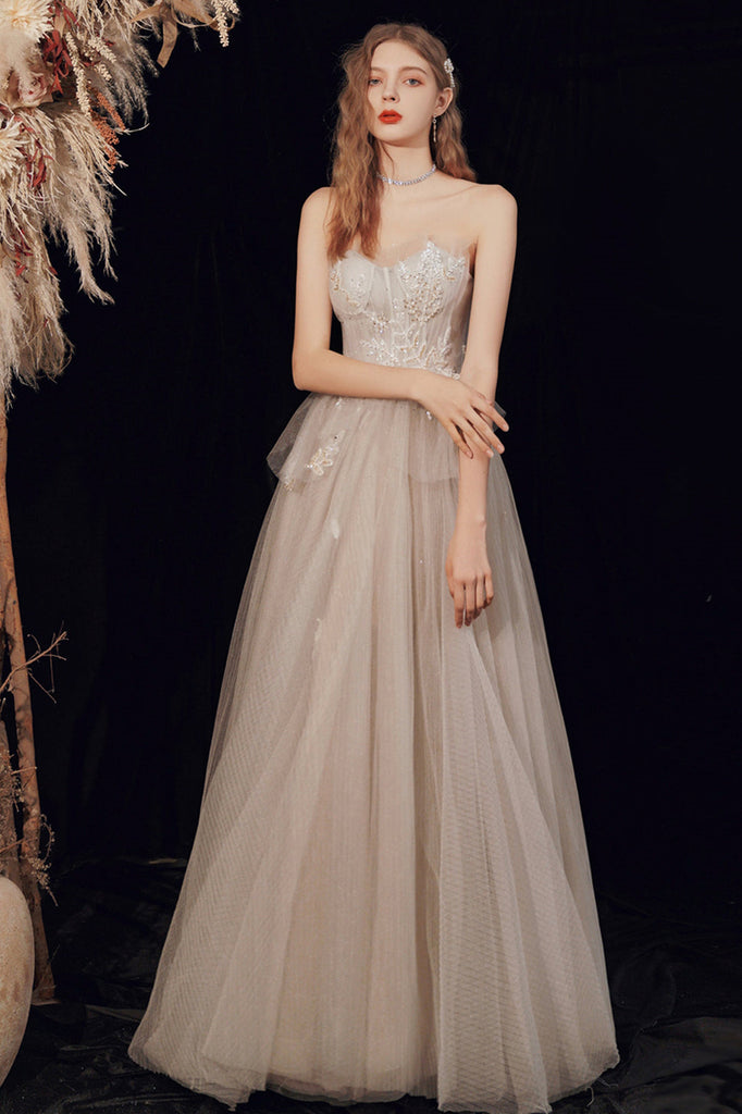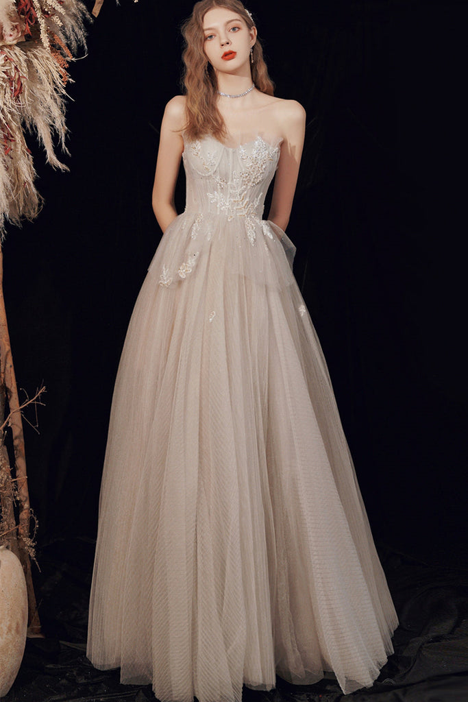 Champagne Tulle Strapless Lace Floral Long Prom Dresses, Champagne Lace Formal Graduation Evening Dresses WT1097