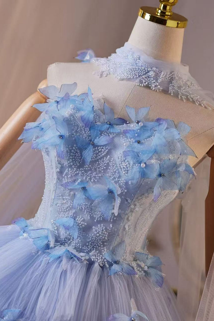 Gorgeous Layered Blue Lace Floral Long Prom Dresses, Blue Lace Formal Dresses, Blue Evening Dresses with Flowers WT1727