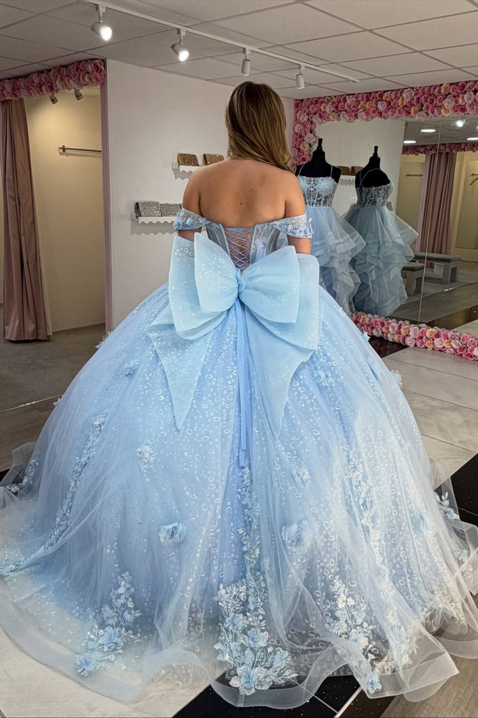 Gorgeous Off the Shoulder Light Blue/Pink Lace Floral Long Prom Dresses, Light Blue/Pink Tulle Formal Evening Dresses, Ball Gown WT1704