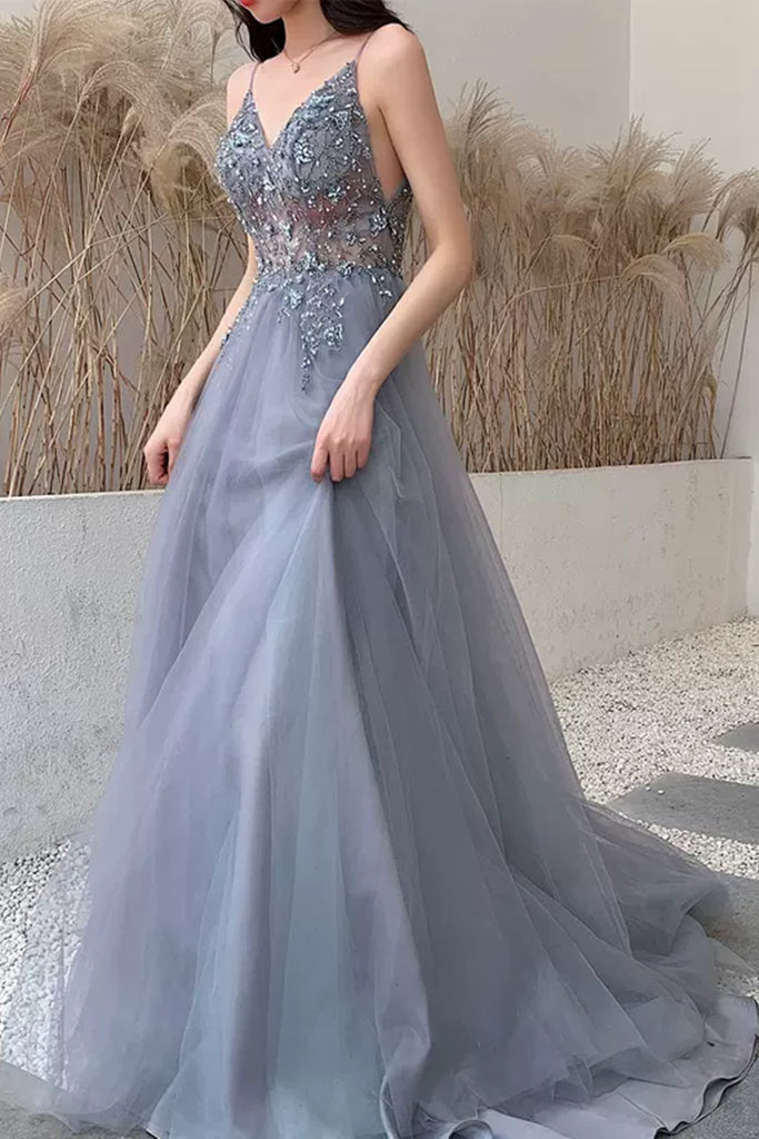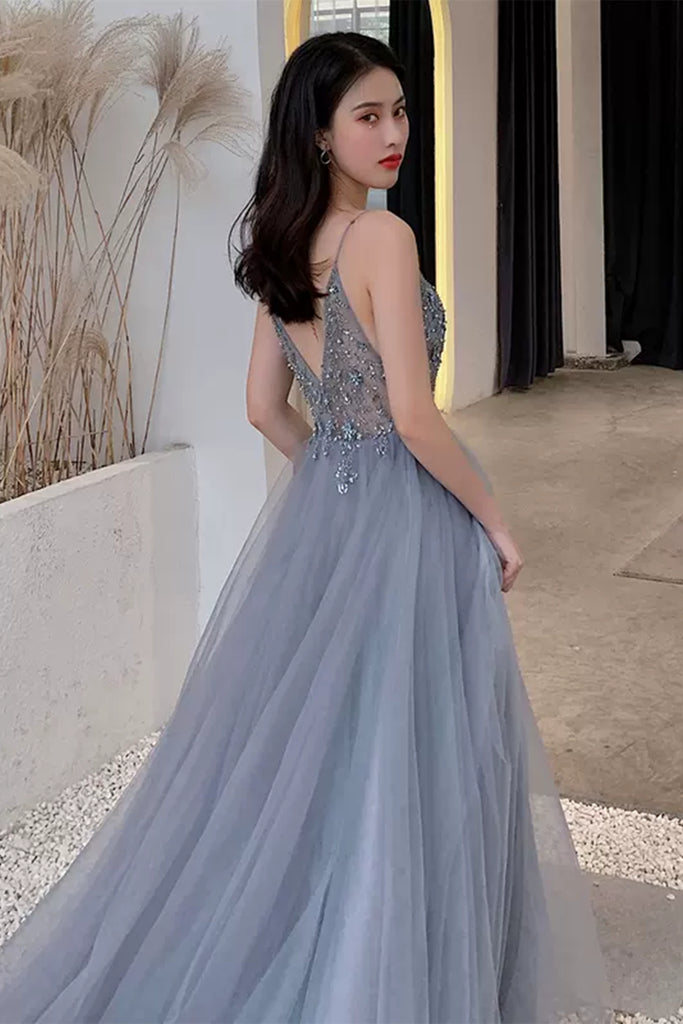 Gray Tulle A Line V Neck Beaded Long Prom Dresses, Grey Formal Graduation Evening Dresses with Beadings WT1018