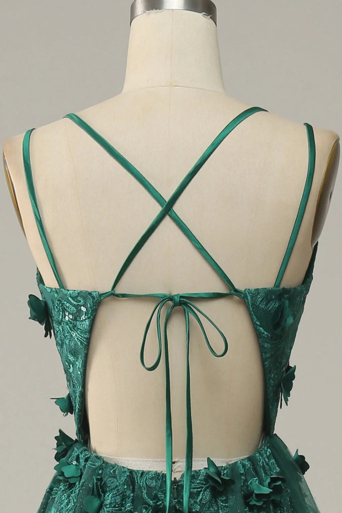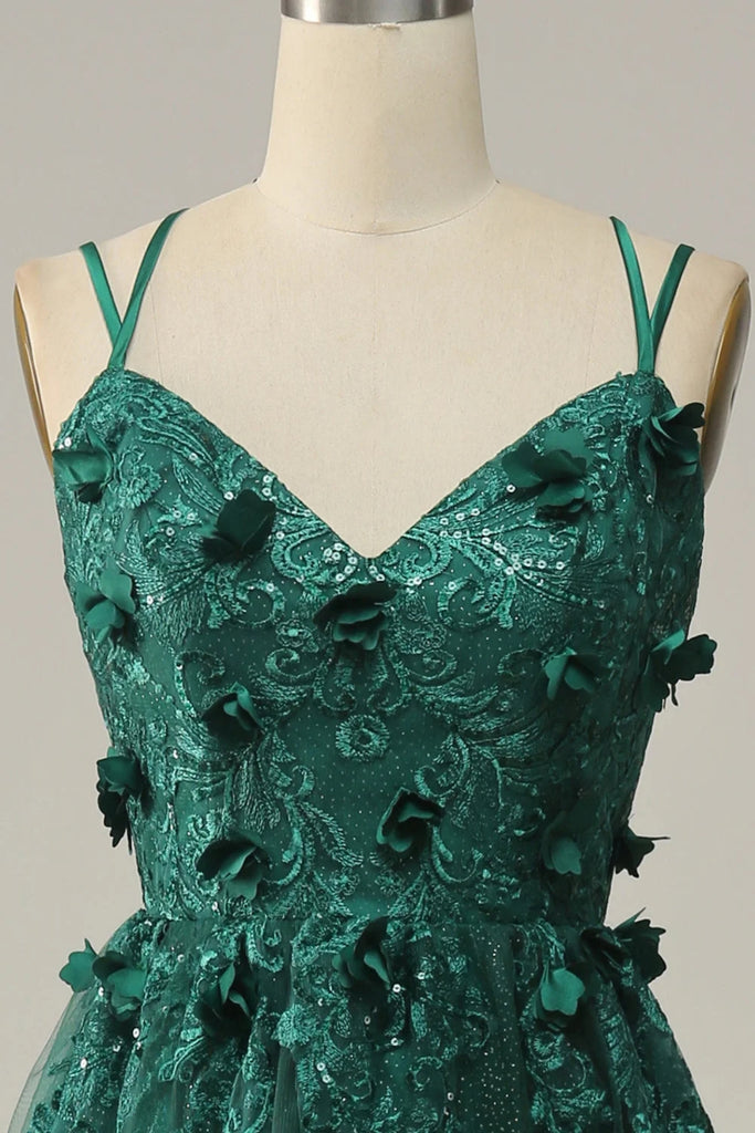 Green Open Back Lace Floral Long Prom Dresses with High Slit, Green Lace Formal Dresses, Green Evening Dresses with 3D Flowers WT1333