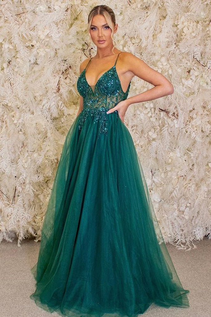 Green Tulle A Line V Neck Beaded Long Prom Dresses, V Neck Beaded Green Formal Graduation Evening Dresses WT1113
