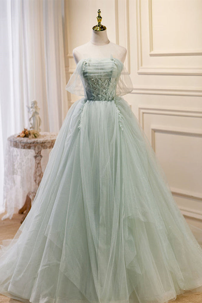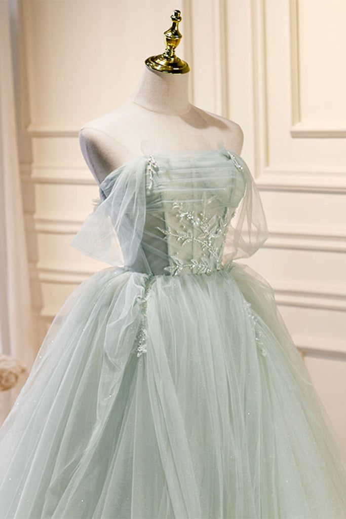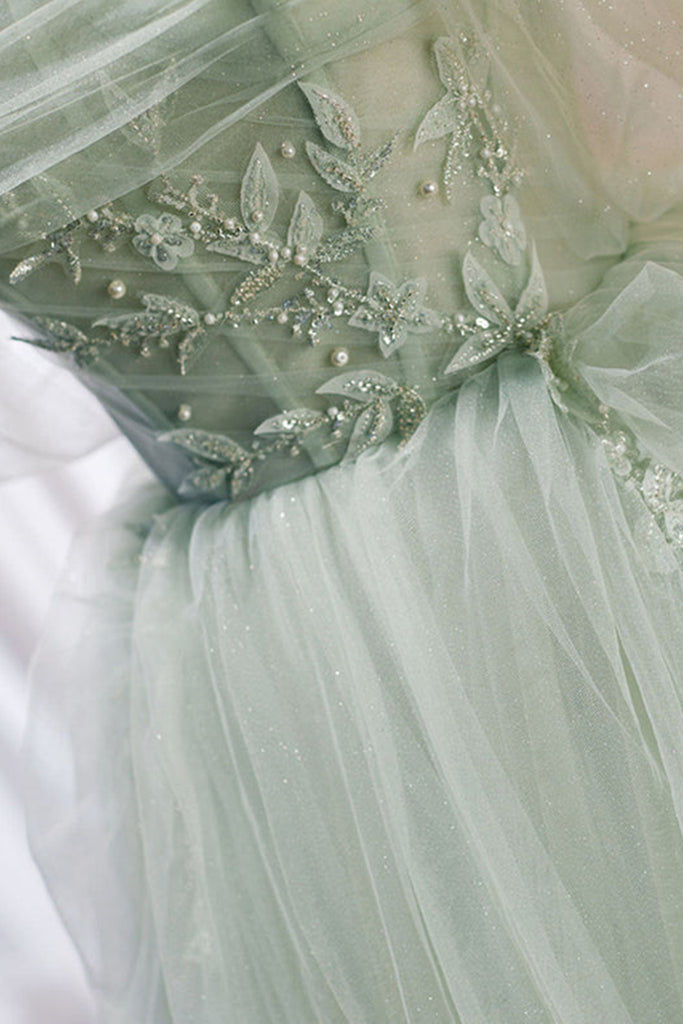 Green Tulle Elegant A Line Beaded Long Prom Dresses, Long Green Formal Evening Dresses WT1160