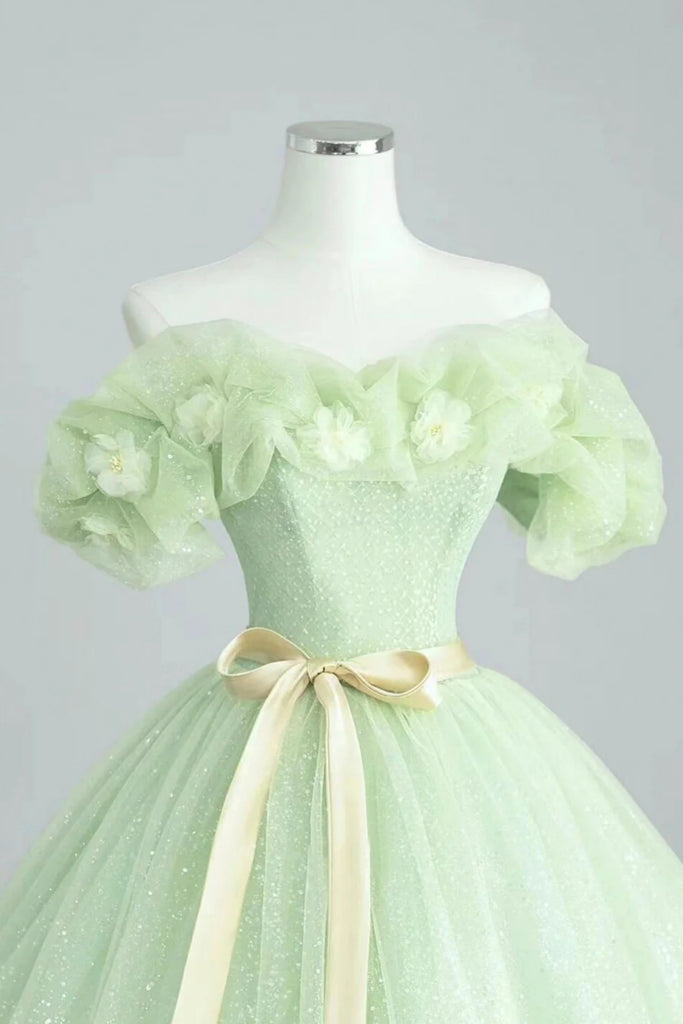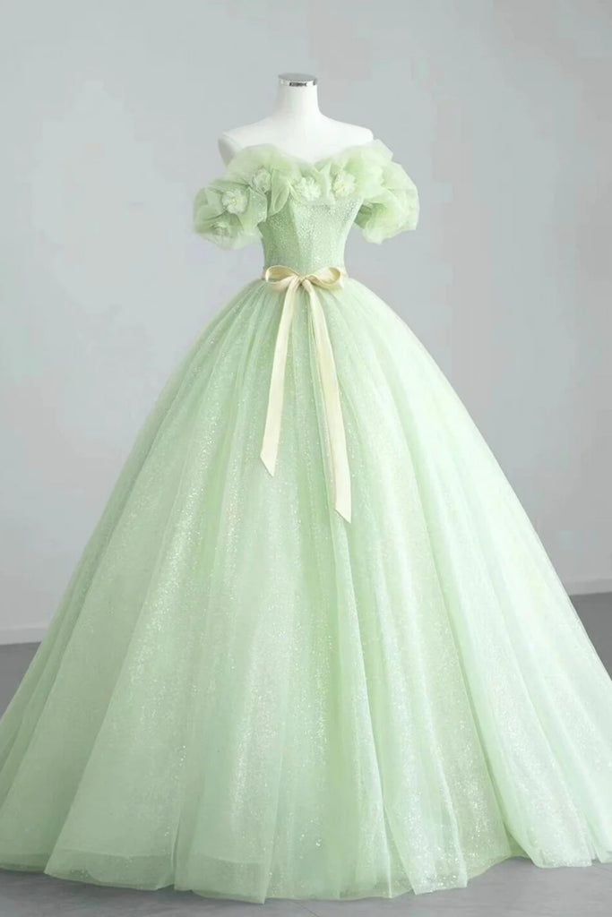 Green Tulle Shiny Off the Shoulder Long Prom Dresses, Long Green Formal Graduation Evening Dresses WT1530