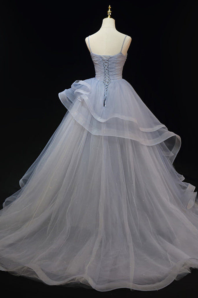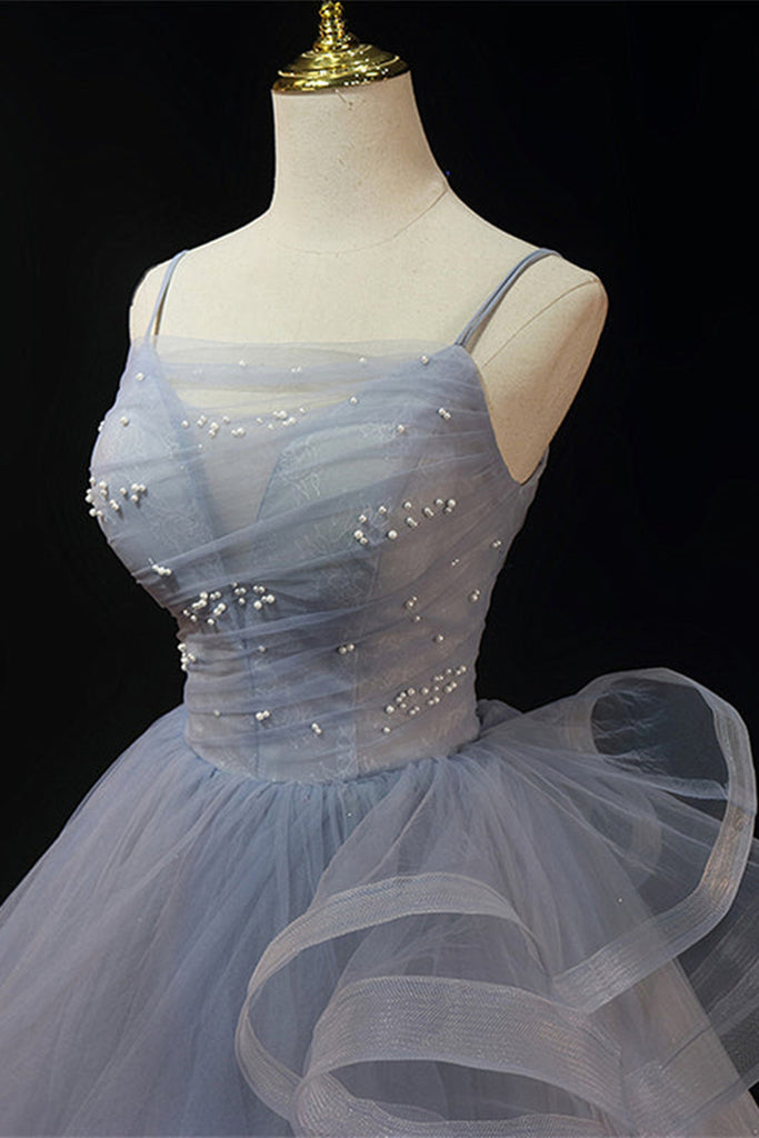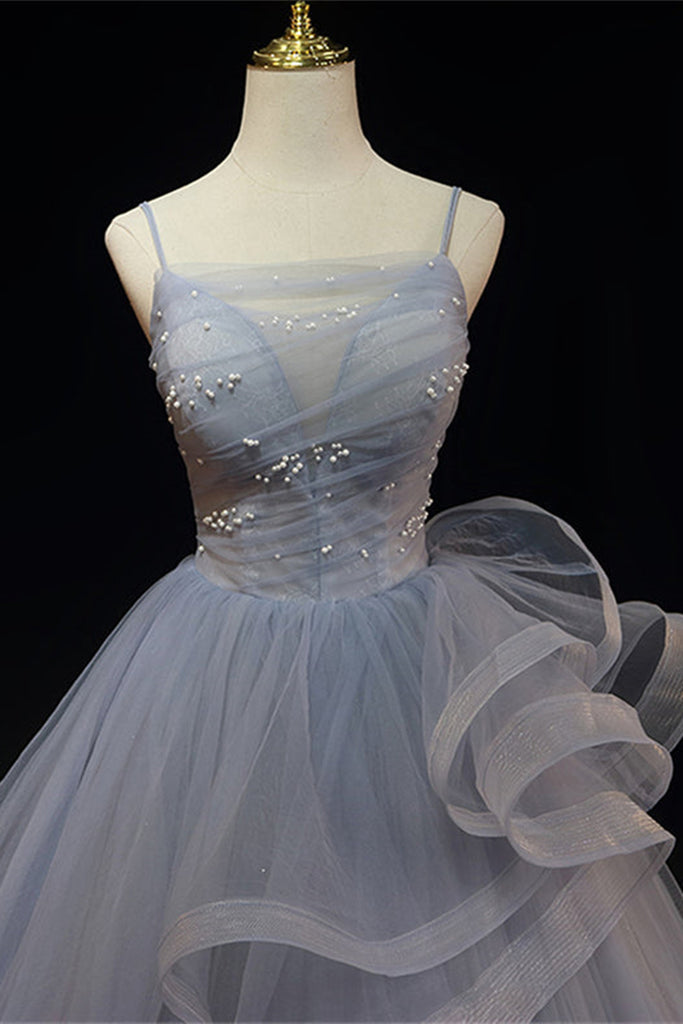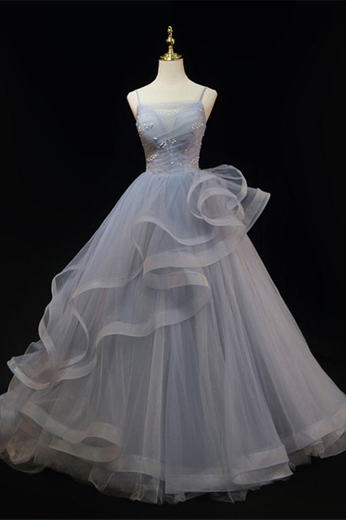 Grey Tulle Thin Straps Layered Beaded Long Prom Dresses, Gray Tulle Formal Evening Dresses, Grey Evening Dresses WT1135