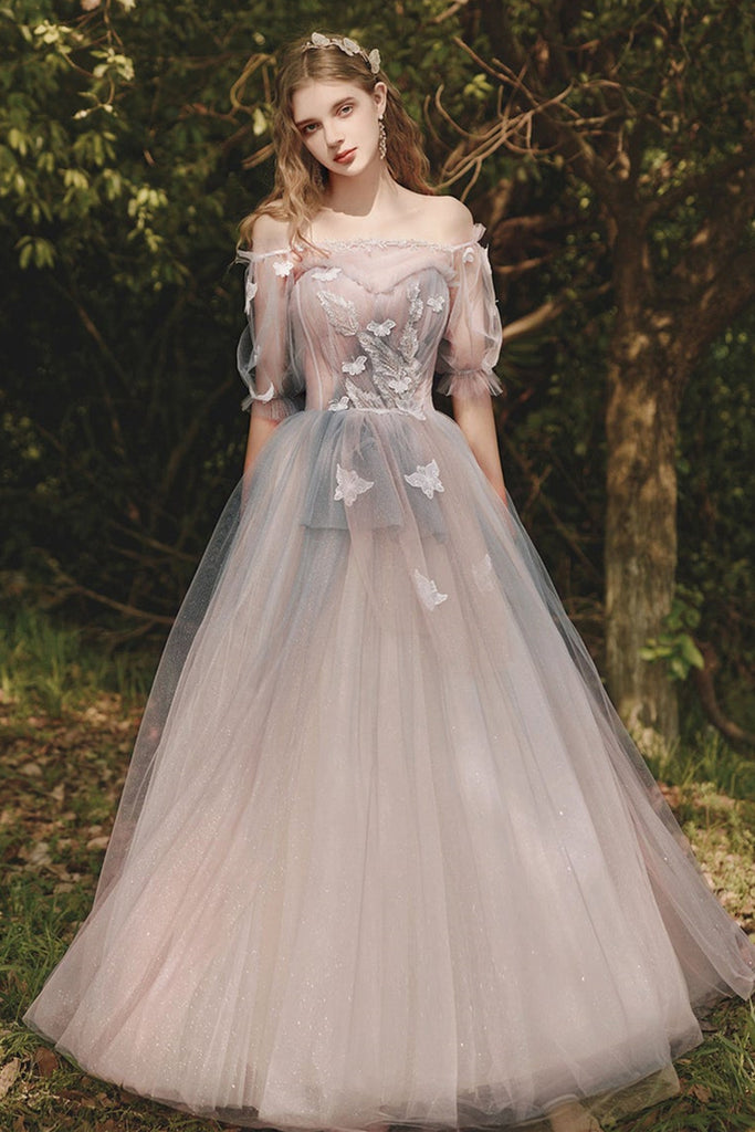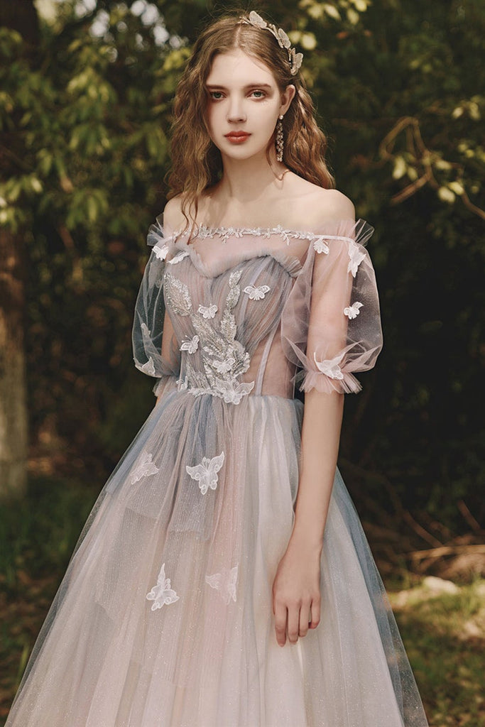 Half Sleeves Champagne Tulle Long Prom Dresses with Lace Appliques, Champagne Lace Formal Dresses, Champagne Evening Dresses