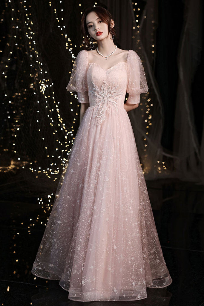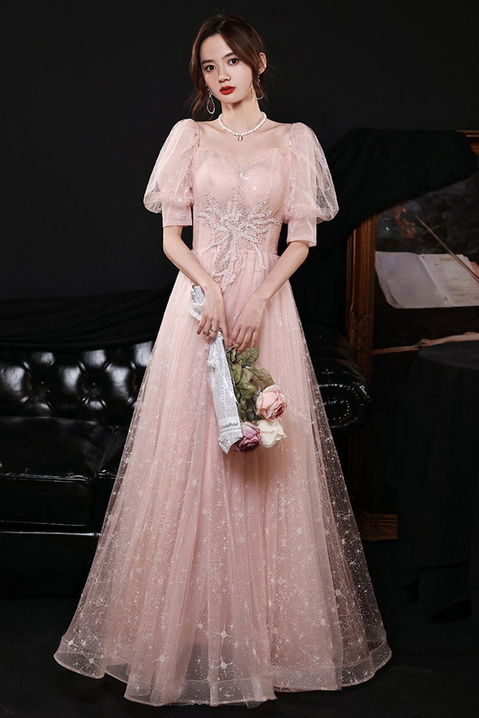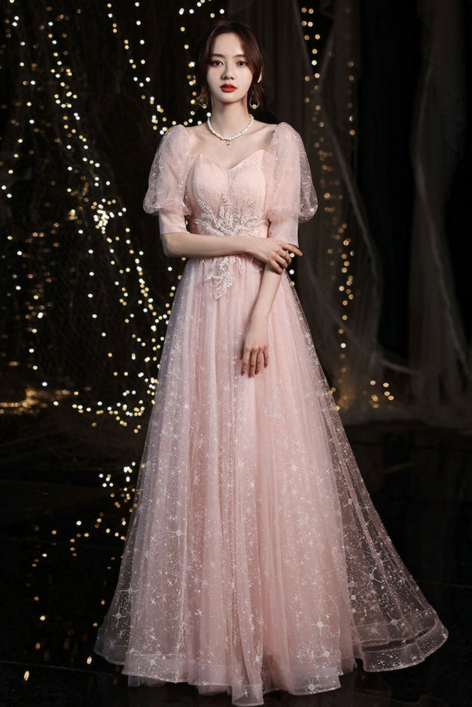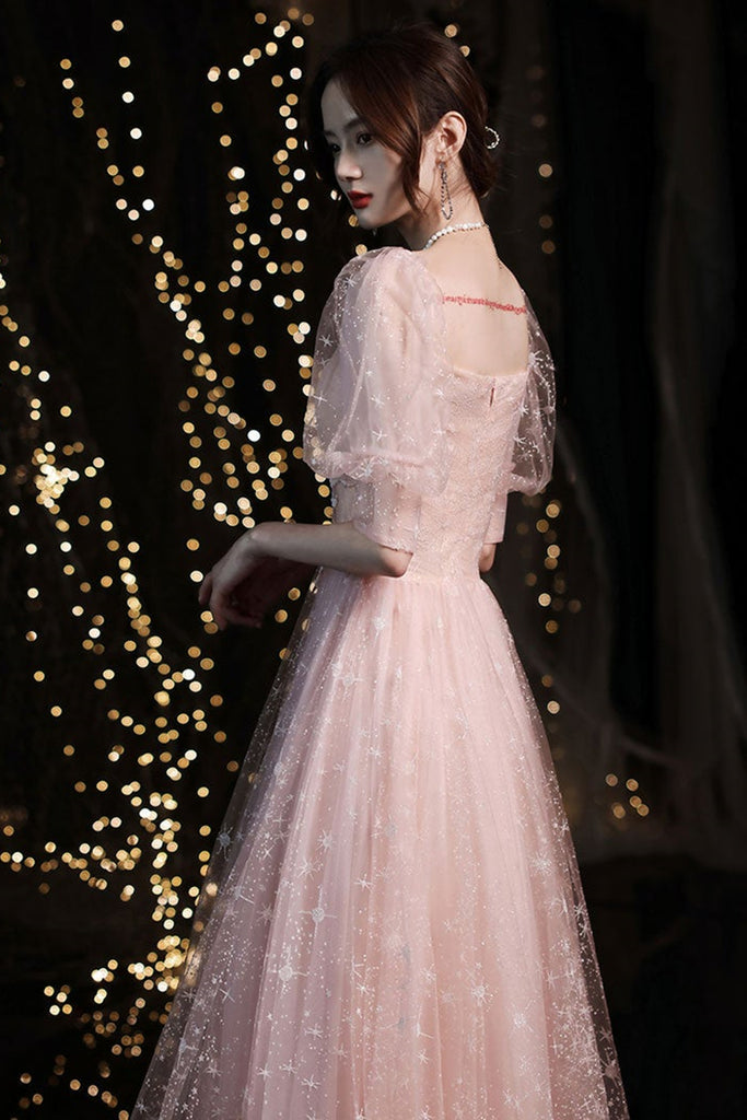 Half Sleeves Pink Lace Long Prom Dresses, Long Sleeves Pink Formal Dresses, Pink Lace Evening Dresses