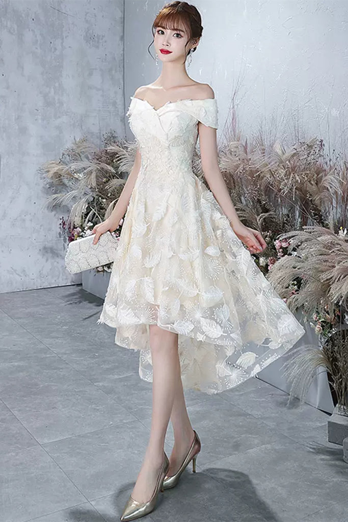 High Low Off Shoulder Champagne Lace Prom Dresses, High Low Champagne Homecoming Dresses, Champagne Lace Formal Evening Dresses WT1008