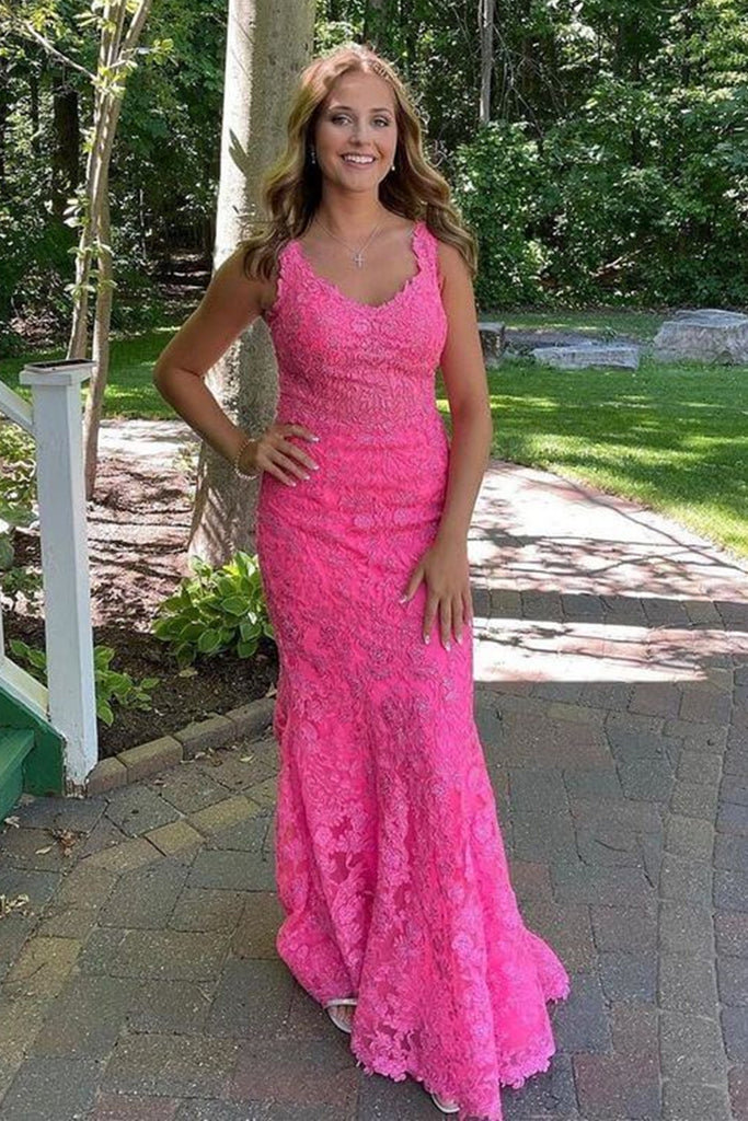 Hot Pink Lace A Line Long Prom Dresses, Hot Pink Lace Formal Dresses, Hot Pink Evening Dresses WT1138